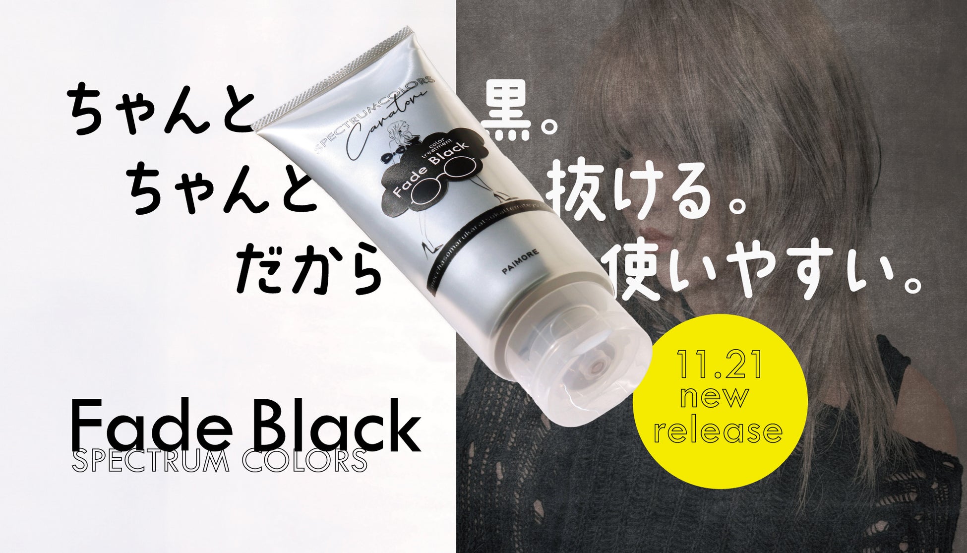 株式会社パイモアは、カラートリートメントシリーズ「スペクトラムカラーズ」の新色として、ブリーチ特化型サロン「いろあそび」代表KUMA氏監修による『フェードブラック』を11月21日より発売いたします。