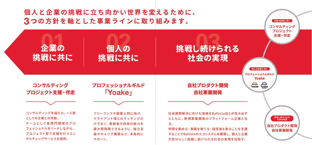 社会課題解決に向けた価値をBallista自らが生み出すとともに、新規事業開発のプラットフォーム企業へと変革をしています。仲間を集める・事業を育てる・経営者を創ることを支援することでBallistaのエコシステムを構築し、個人と企業が自分らしく挑戦し続けられる社会の実現を目指しており、今回のInfiqueはその事業の1つに位置づけられます。