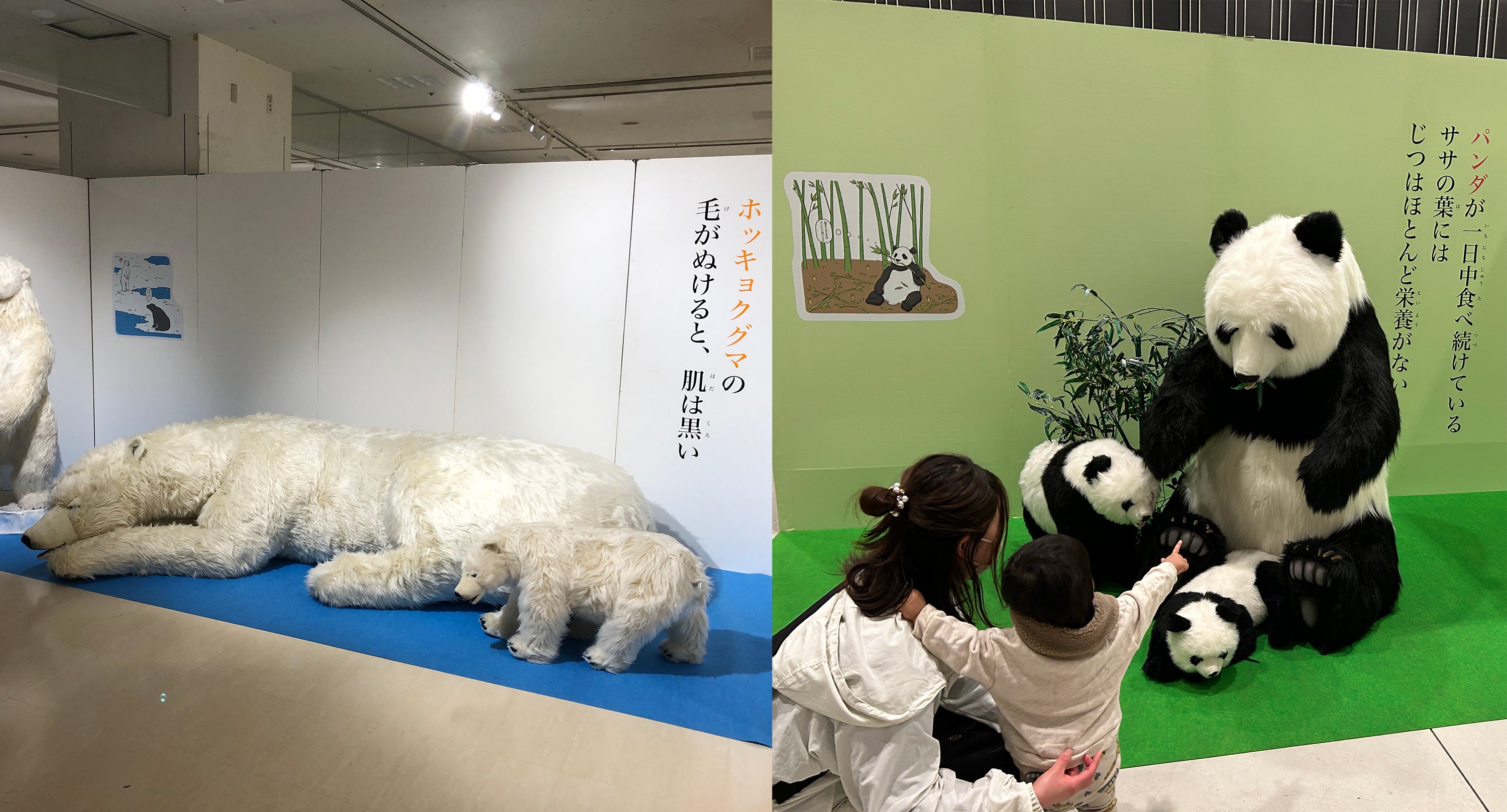 ホッキョクグマ・ゾウ・トナカイ・アメリカバイソン・カバ・アルパカ・パンダの計7種類のぬいぐるみを展示。