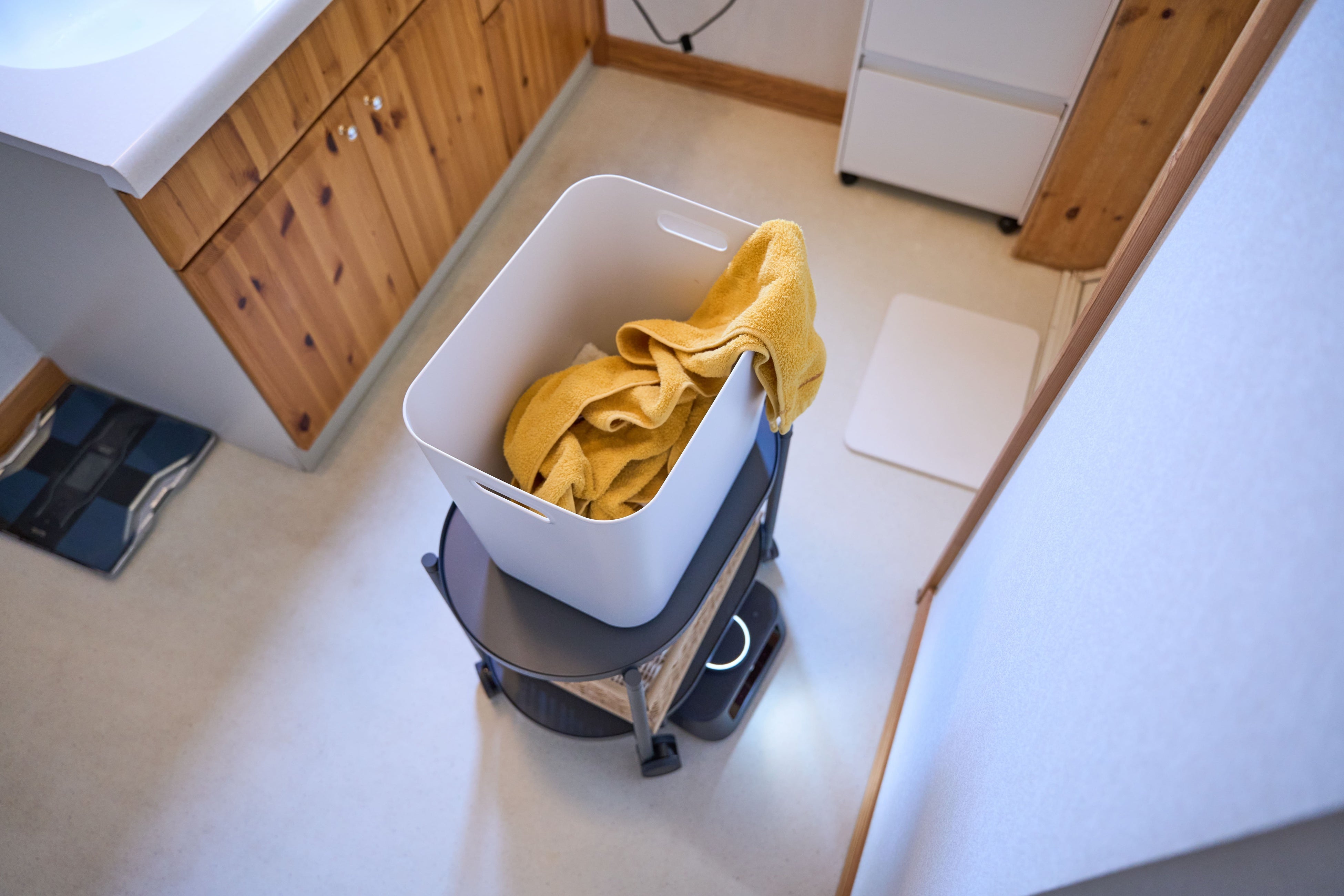 朝食をダイニングに届けた後のカチャカは、次に仕事道具を玄関に運ぶように設定。以前はバッグの置き場が定まらず、雑然とリビングの床に置くこともありました。カチャカを活用して定位置が決まったことでリビングがスッキリし、妻にも好評です。