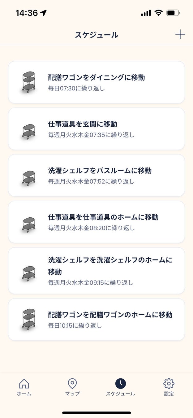 決まった曜日・時間にカチャカを動かす「スケジュール」をいくつも登録することで、生活の中にルーティンを確立。3台のシェルフ(配膳ワゴン、仕事道具、洗濯シェルフ)をすべて、スケジュールで動かしています。