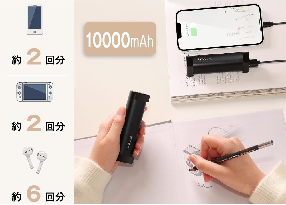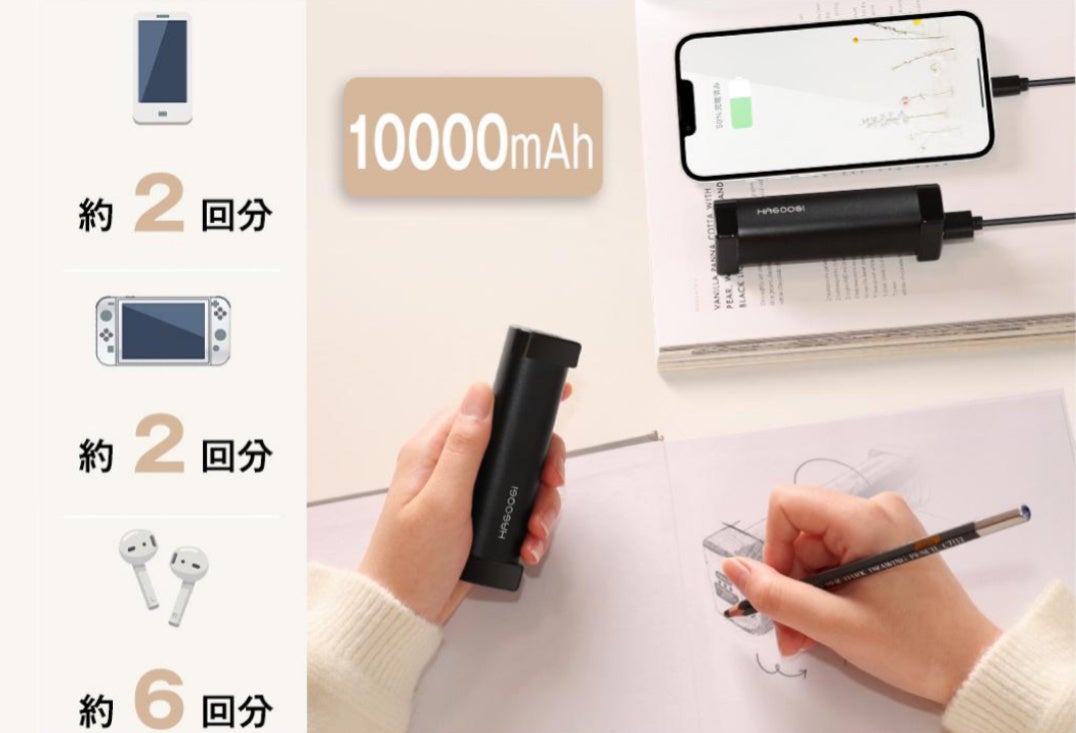 年間を通じて利用できる便利なモバイルバッテリー機能が備わり、1本は手を温めながら、もう1本はスマホを充電することもOK!別途のモバイルバッテリーを持ち歩く必要がないため、外出時の荷物を軽減したい方にもおすすめです。10,000mAhの大容量バッテリーは、最大14時間の連続使用が可能で、iPhone15を2回充電できます。また、USB Cにより充電時間も短縮されます。出張や旅行だけでなく、台風や地震などの緊急災害時にも緊急電源として最適です。