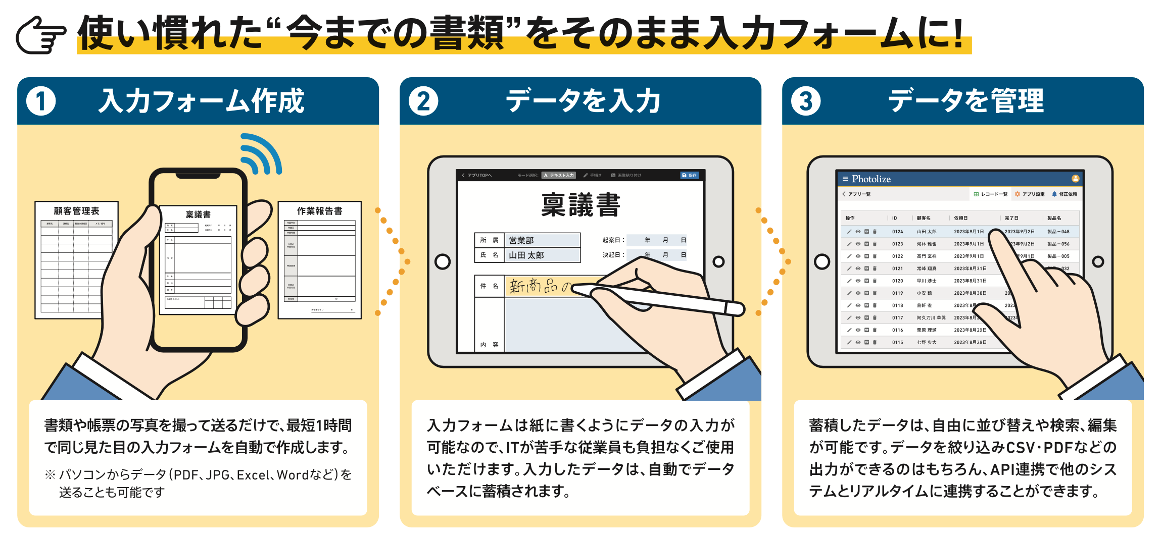 ▼▼Photolizeは現場担当者がシステム開発を行うようなイメージで、ユーザーから送られてきた書類をそのまま背景として設置して、その上にデータ入力枠と写真の貼り付け、手描きを可能とすることでWEB上で紙のように使用することができます。