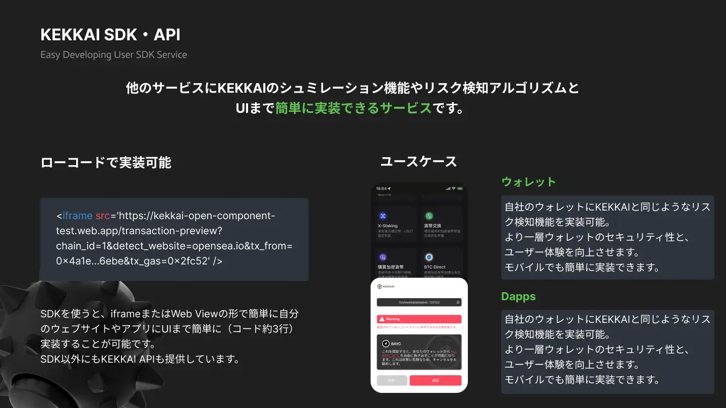 KEKKAIに実装されている「トランザクションをシミュレーションする機能」と「詐欺取引を検知する機能」をパッケージング化したSDK・APIサービスを展開しています。