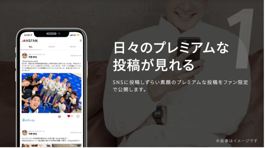 1. プレミアム投稿の閲覧→アスリートがSNSでは投稿しないASFAN内だけのプレミアムな投稿をファンは閲覧することが可能です。選手のプライベートにより近づくことができます。