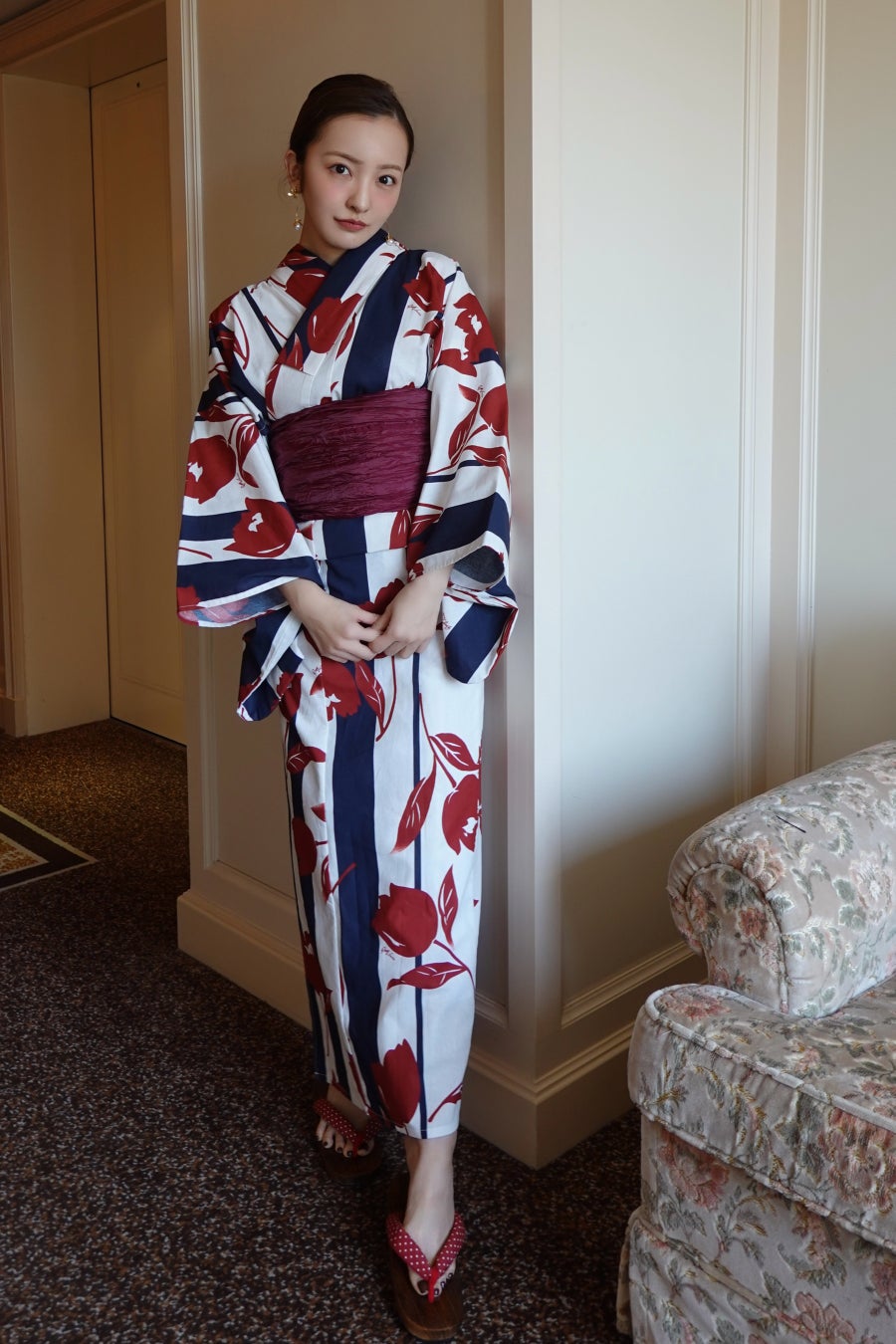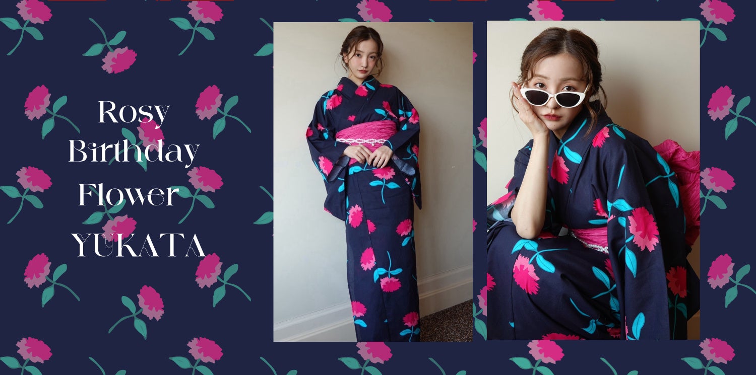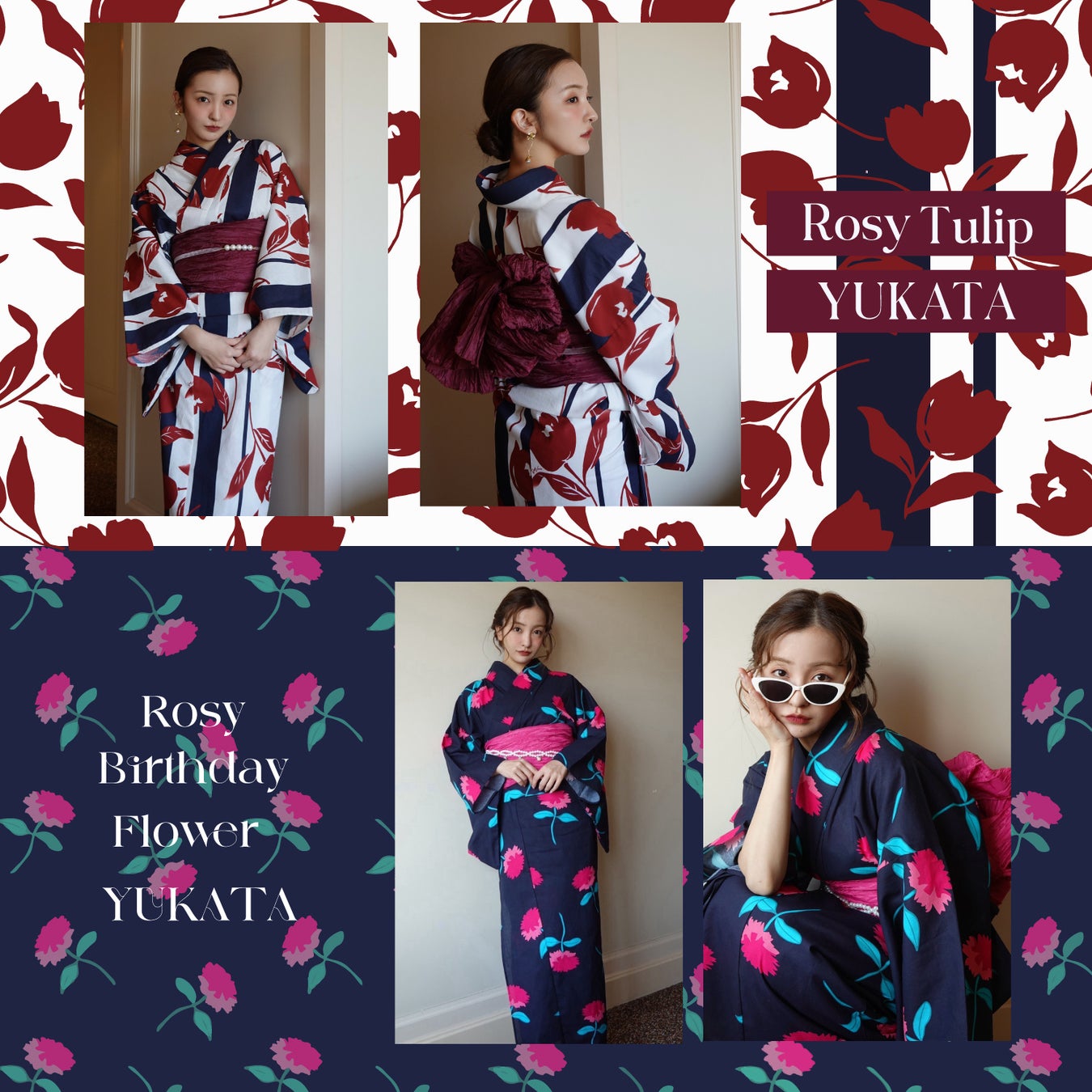 2023年に発売し、好評をいただいたバースデードレスや、2024年に発売したRosy luce初の水着にデザインした、描き起しのオリジナルフラワー柄を浴衣用にアレンジしたこだわりの1着。