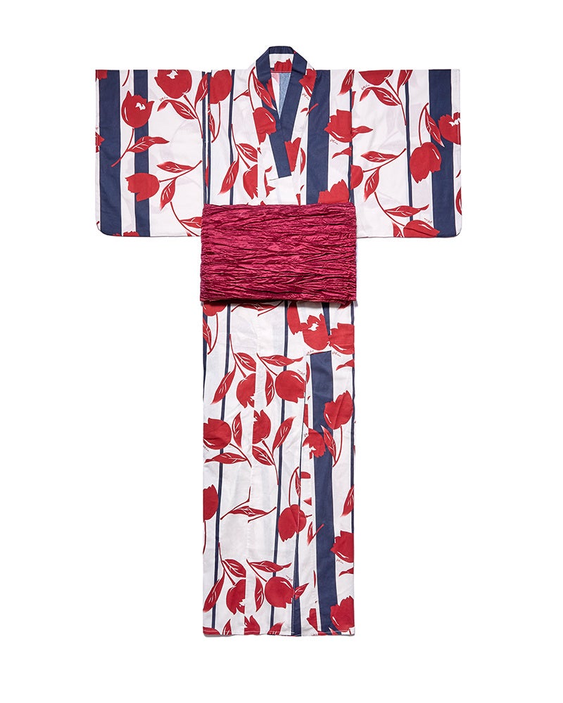 チューリップの柄とマッチしたカラーのしわ兵児帯がセット。