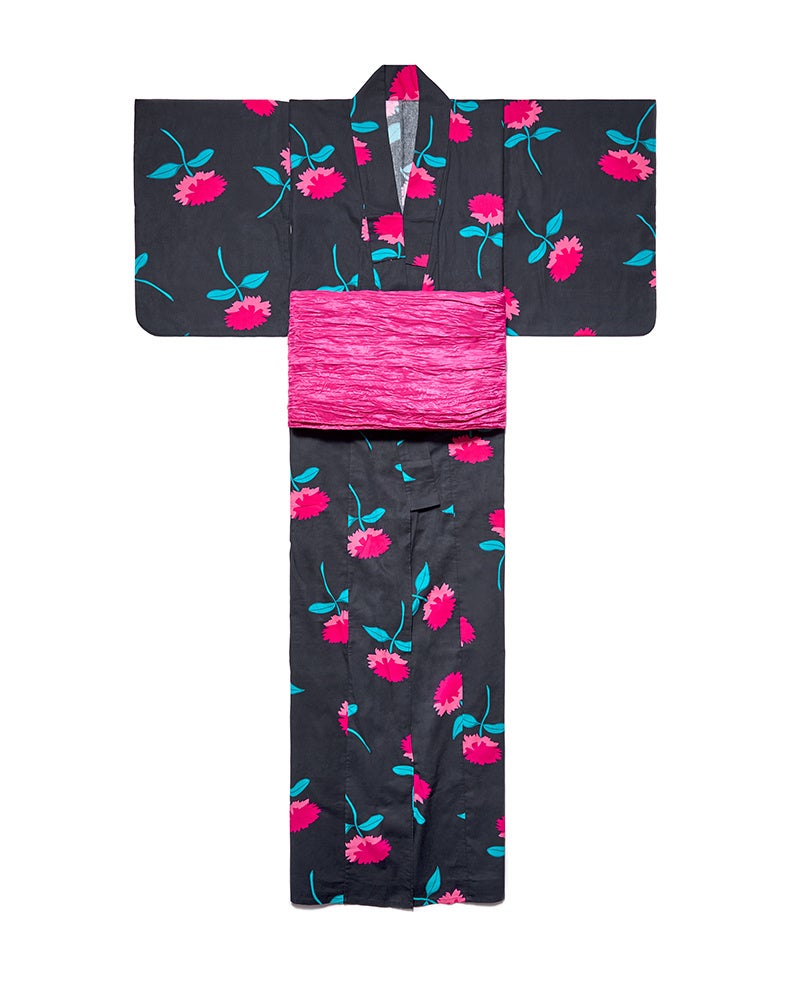 ピンクのお花を散りばめたネイビー地の浴衣は、ビビットピンクの兵児帯がアクセント。