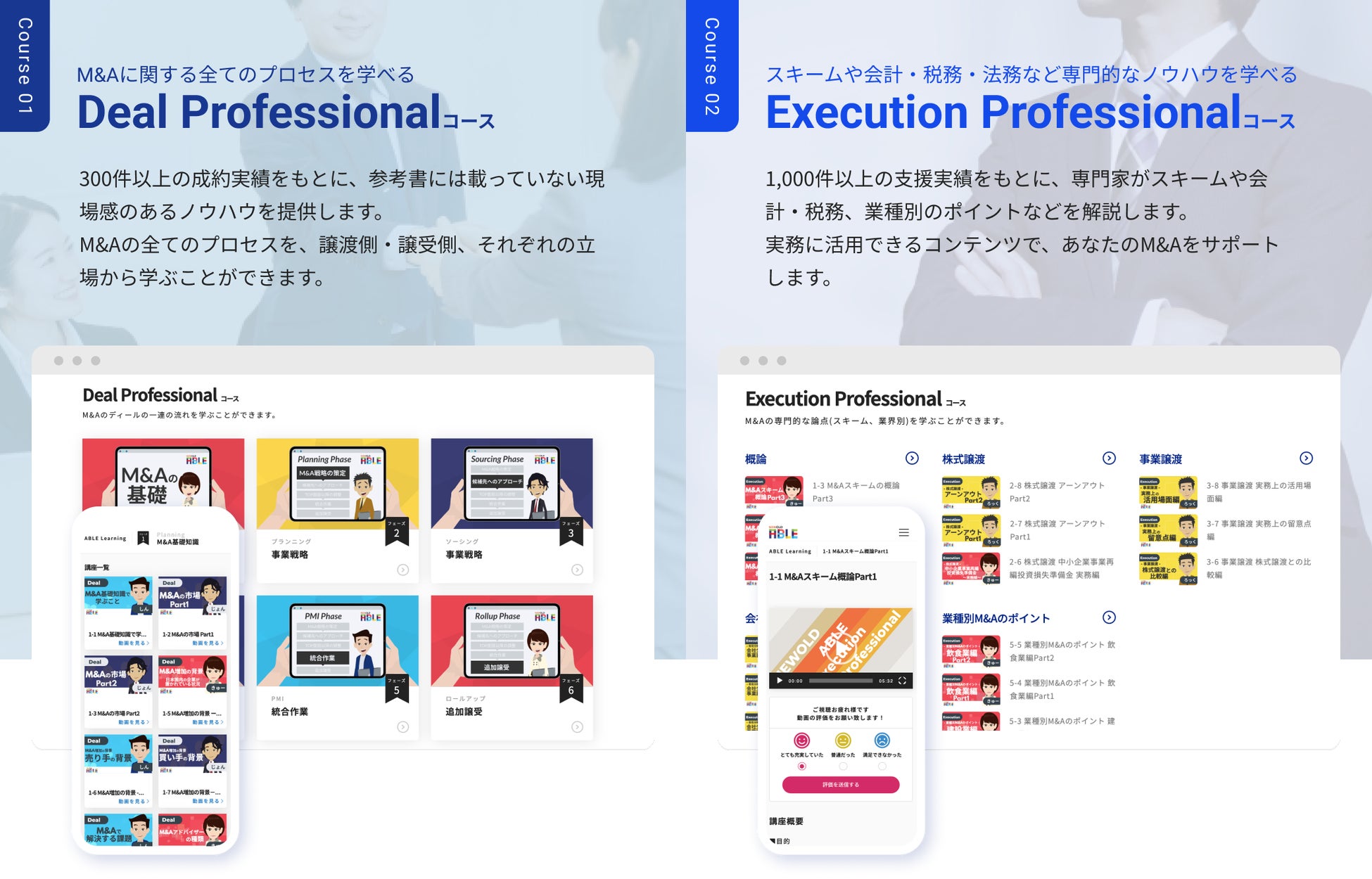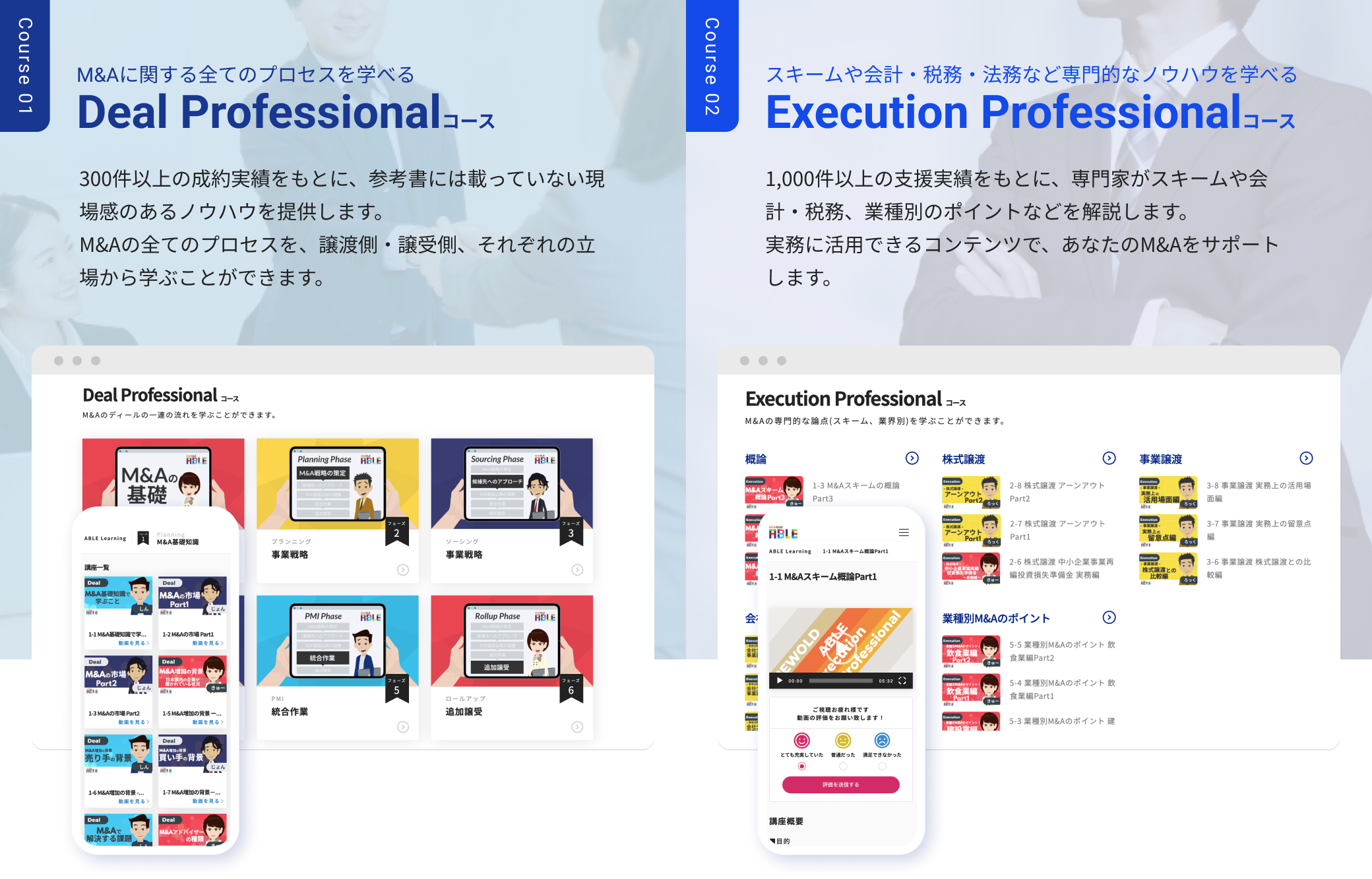 税務や法務などM&A実務に必要な専門知識を学べる「Execution Professionalコース」の2コース、約100本の豊富なコンテンツを無料でお楽しみいただけます。