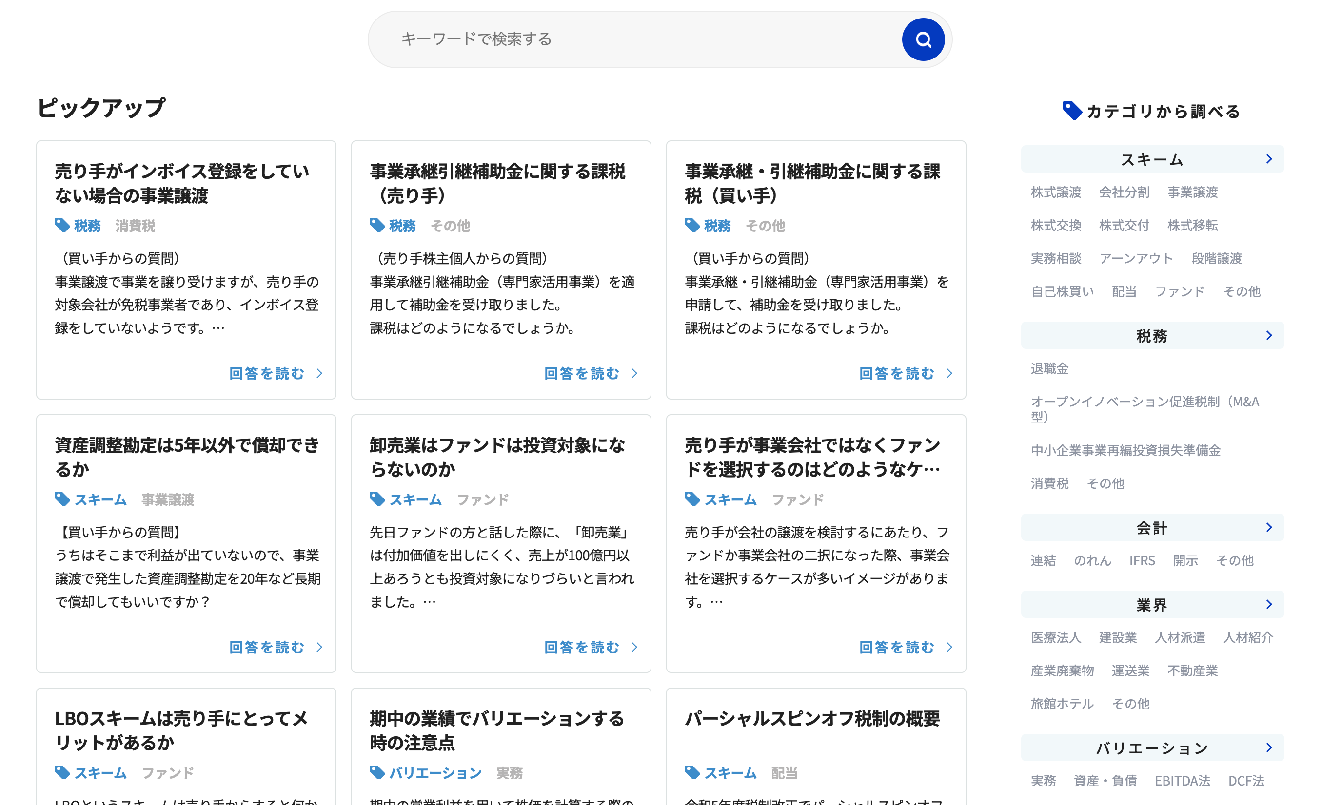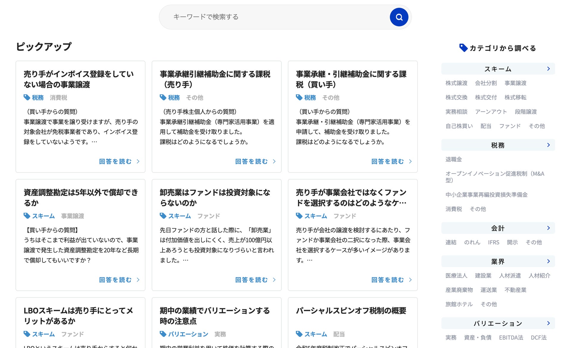 弁護士、会計士、税理士、社労士など、様々な分野の専門家の知見をもとに、M&Aで役に立つ様々な内容を検索式Q&Aで提供しています。