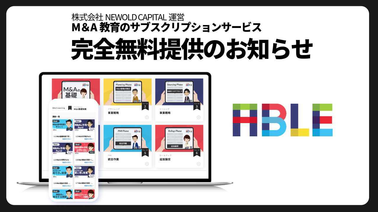 その取り組みの一環として、NEWOLDは「M&Aの確かな知識とノウハウをより多くの人に広める」という使命のもと、これまで有料で提供してきましたM&A教育のサブスクリプションサービス「NEWOLD ABLE」をこの度、完全無料化いたします。