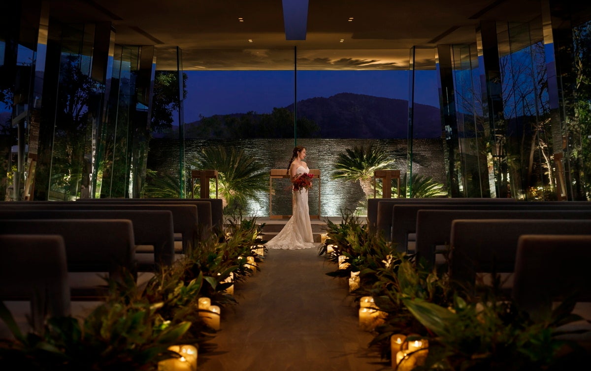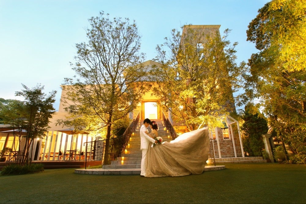 また、ガーデンやチャペル、神殿といった幅広いロケーションで撮影をお楽しみいただけるのがザ・オランジェガーデン五十鈴川の魅力のひとつです。煌めく夏ならではの草木の鮮やかな緑が映える明るく爽やかなショットや、少し日が落ちて涼しくなった夕暮れ時に撮影するドラマティックなショット、さらに陽が沈んだチャペルでのロマンティックな雰囲気のショットが8月の「フォトウエディング」ではおすすめです!