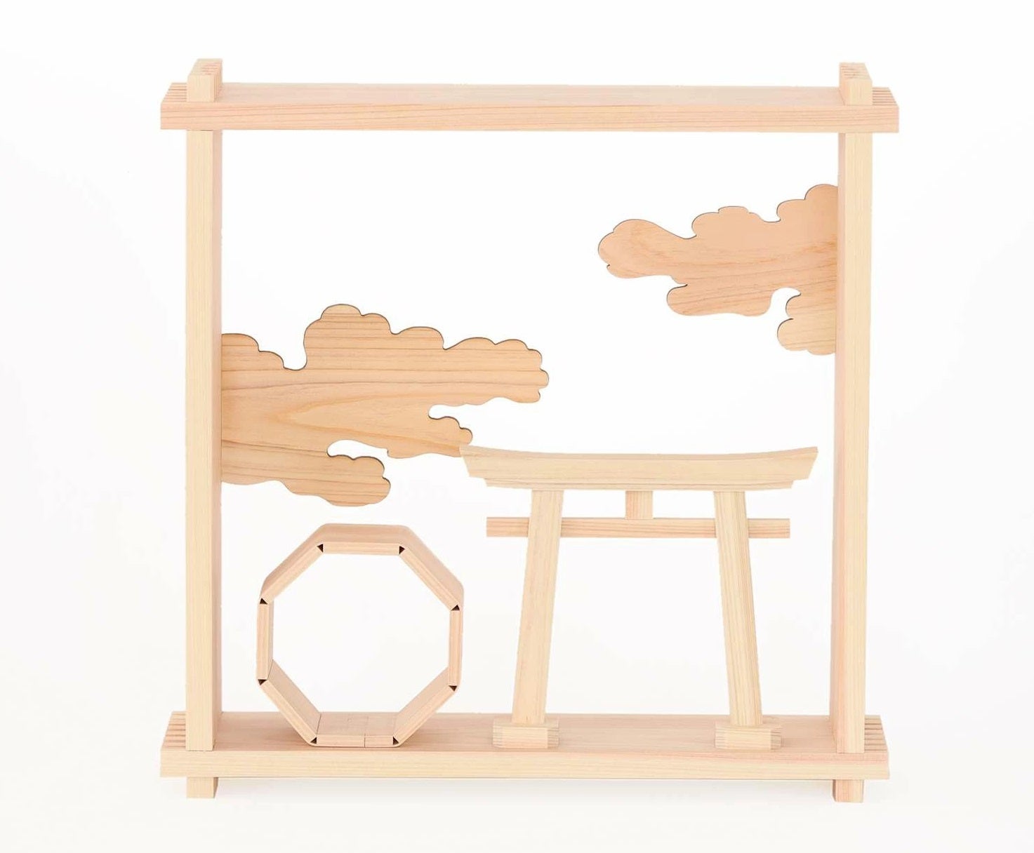 国産・手作りにこだわり、上質な「紀州桧」を使用した機能的な神棚。赤みを帯びる木肌は豊富な油分を含み、湿気に強く変形や腐食が起きにくい素材。職人の技とデザイナーの感性で企画されました。天界を象徴する白雲に大鳥居をあしらい、四角形と八角形のフレームが神聖さと洗練を演出。シースルー構造で壁紙が背景としてなじむため、絵画のような佇まいを楽しめます。