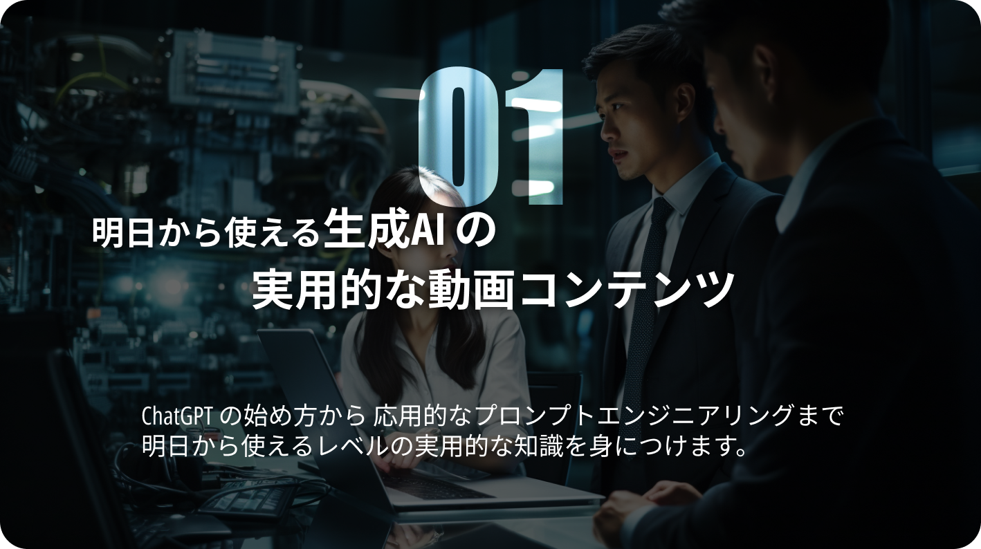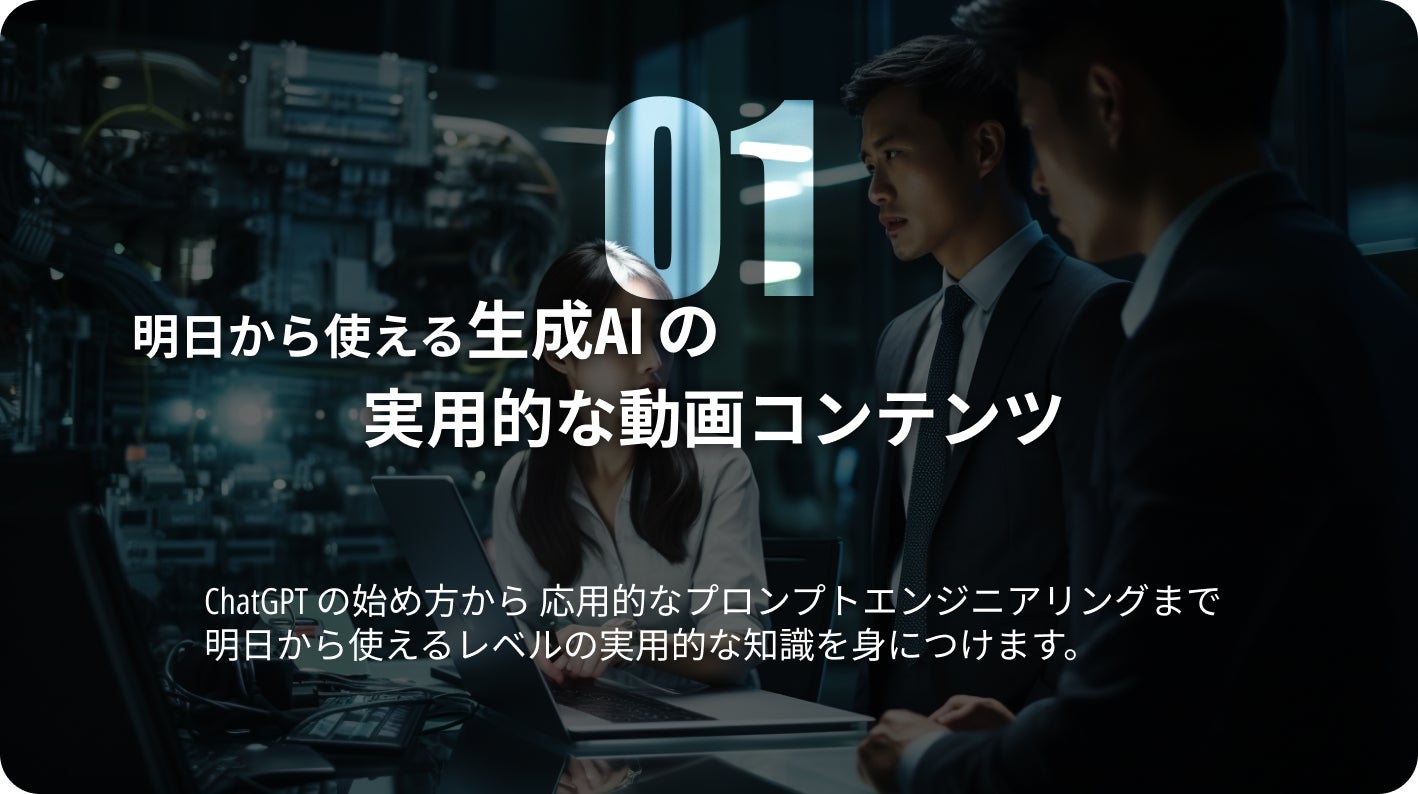 ChatGPTをはじめとするAIの研究者やエンジニアのみを集めた生成AIのプロ集団によって監修された動画コンテンツで生成AIの学習を行うことができます。業務効率化に直接役立つプロンプトエンジニアリングから論文レベルの学術理解まで幅広く支援を行います。