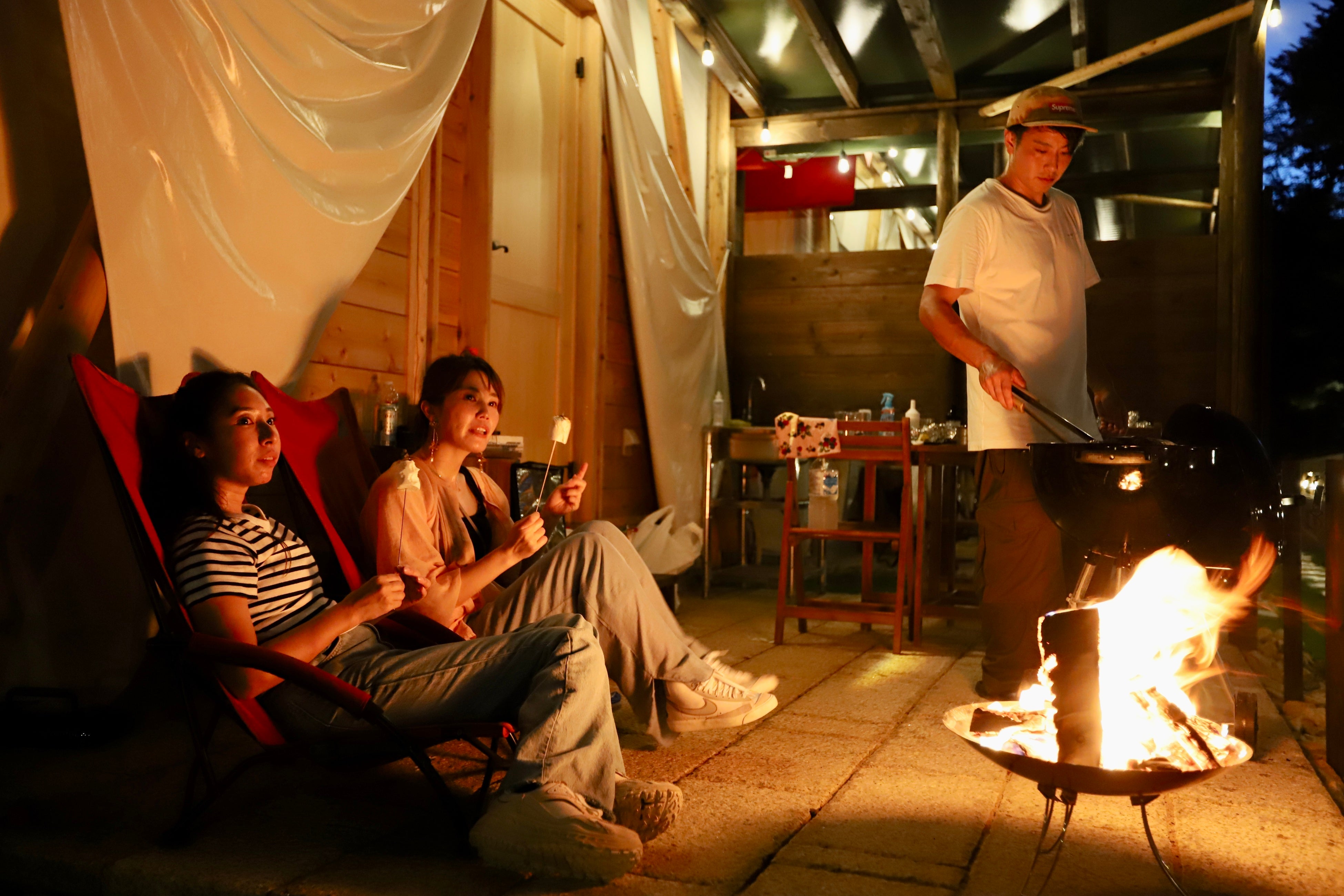 BBQサイト付きグランピングテントにはエアコン・洗面台・トイレ・浴室を完備!