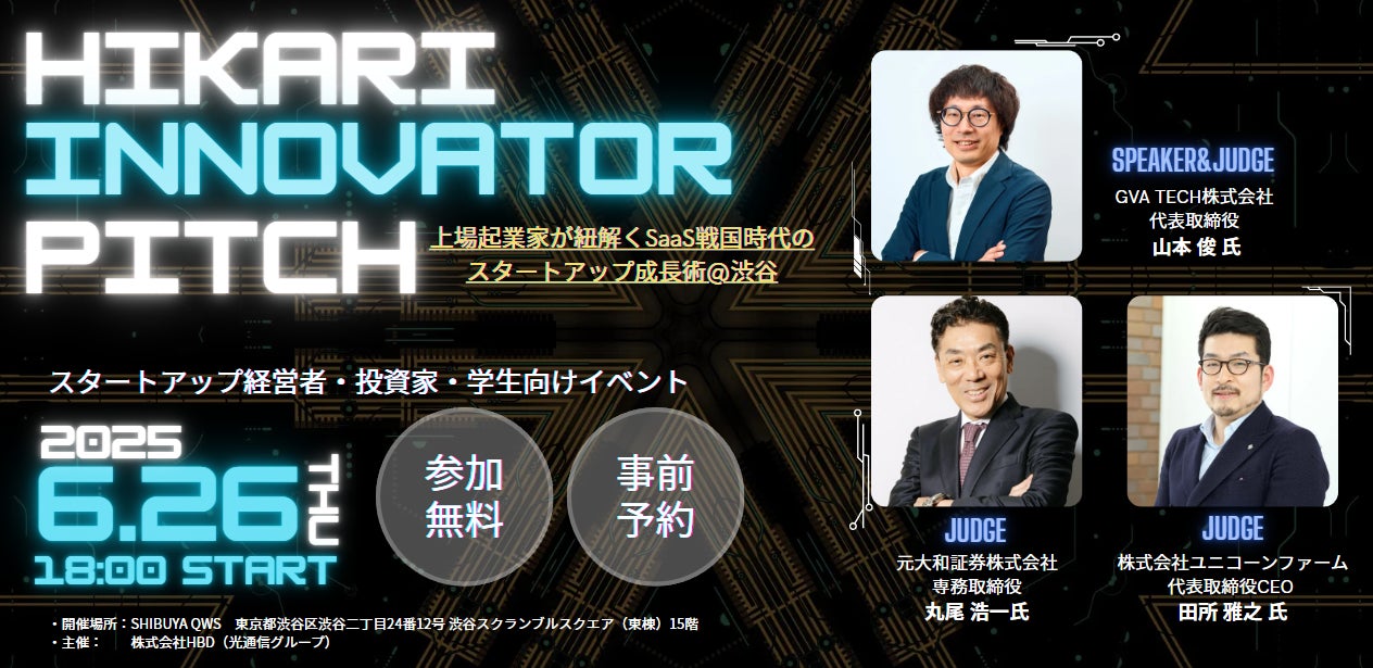 昨年12月開催の「HIKARI INNOVATOR PITCH」の第2弾!注目の若手上場起業家からSaaSビジネスで起業/事業拡大する方法を学びたい方、魅力的なプロダクトを持つ経営者と出会いたい方必見