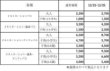 今年はイルミネーションだけの単券チケットを新たに販売いたします。さらにホテルレストランでのイタリアンディナーブッフェや温泉も楽しめるお得なセット券もご用意しております。