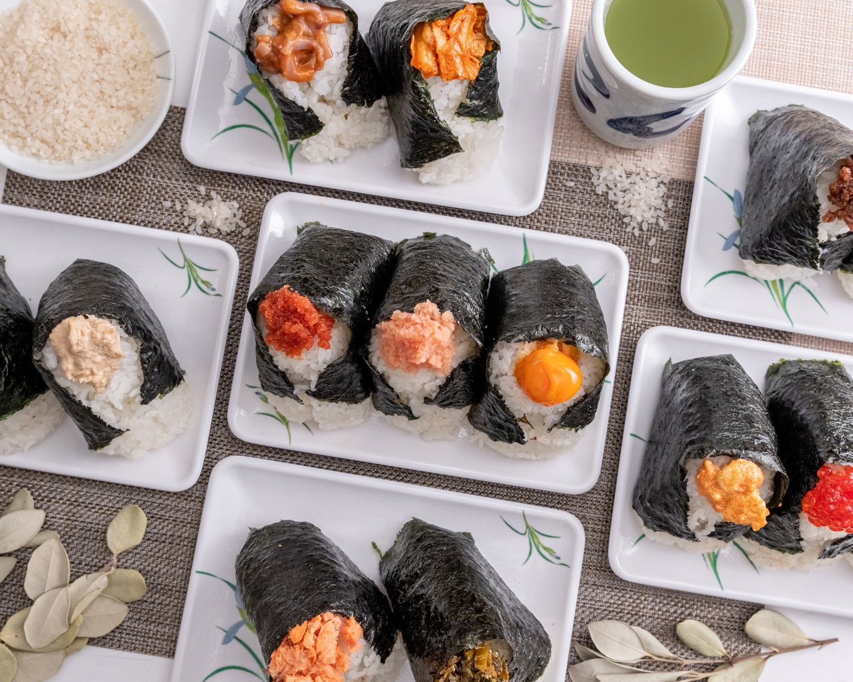 しゃけやうめ、しそ昆布などのスタンダードな具材を始め、『じゃこ⽣七味』や『明太クリームチーズ』、『卵⻩の醤油漬け』などの変わり種も多数取り揃えている。
