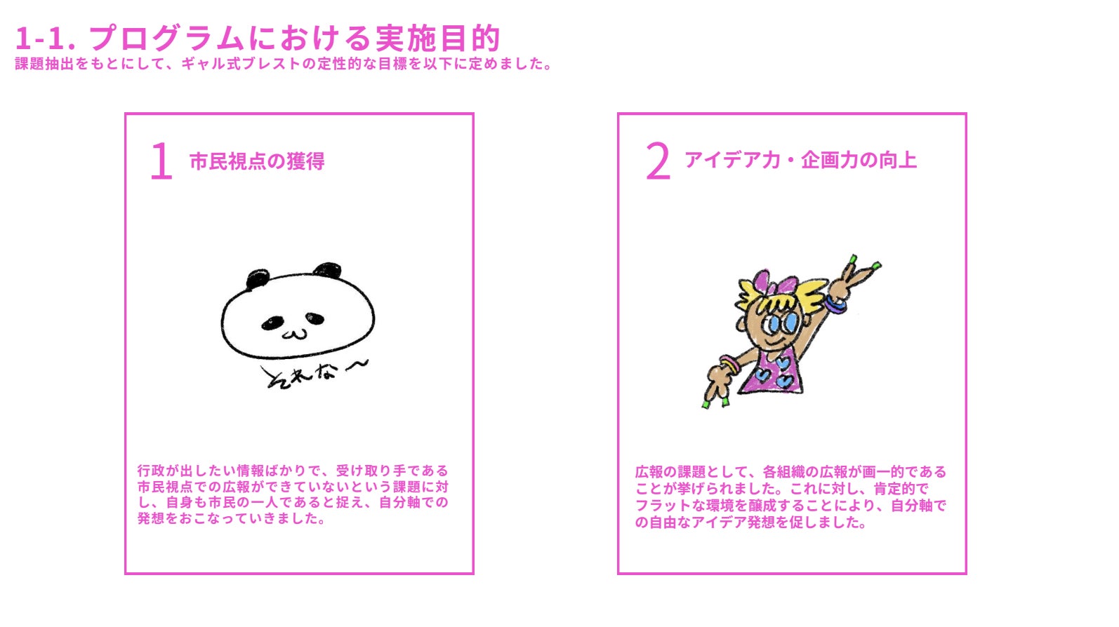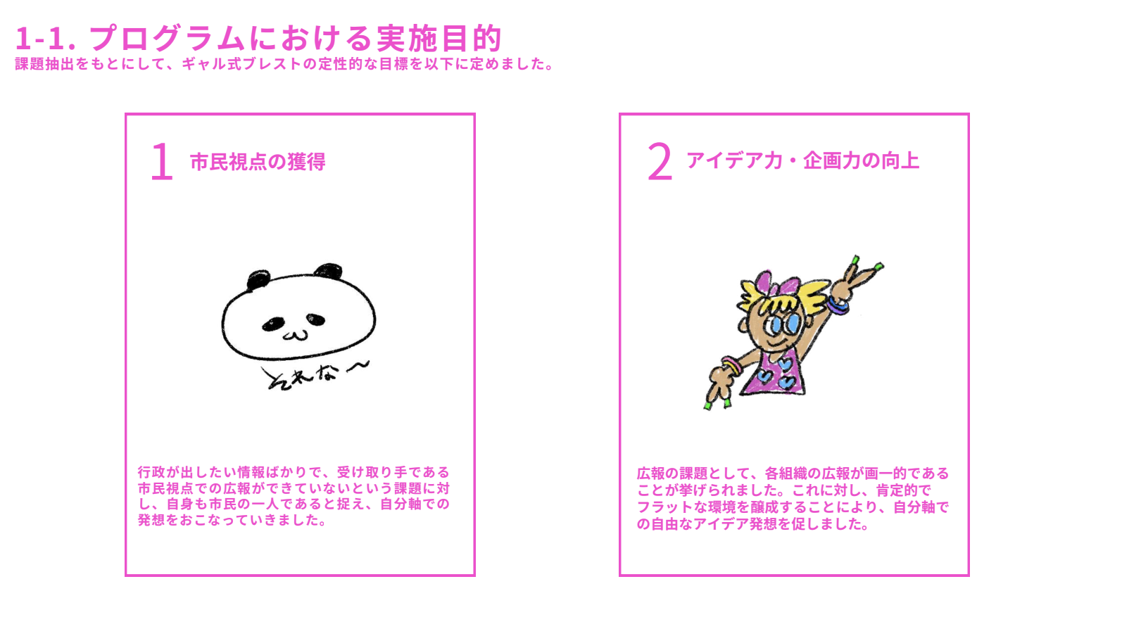 一つは「市民視点の獲得」。これまでは行政用語を使って、行政側が伝えたい情報を発信してしまっていたそう。そこで、まずは参加者が“自身も市民のひとりである”という視点で、市民側の気持ちを考えられられることを目標におきました。