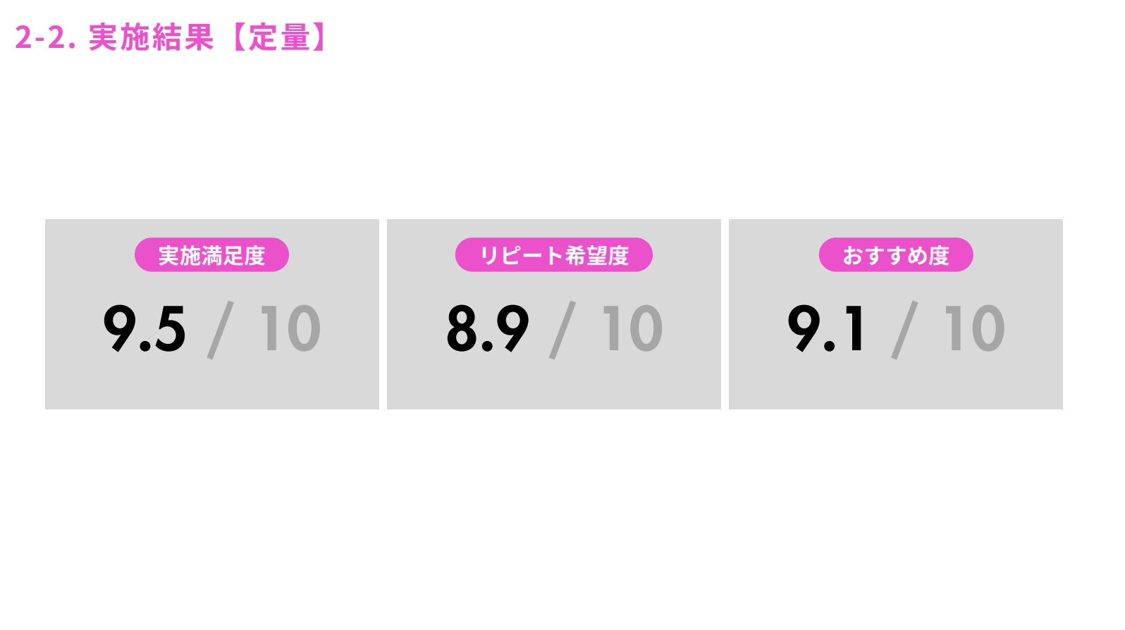 イベント後に実施した定量のアンケートでは「実施満足度」が9.5/10、「リピート希望度」が8.9/10、「おすすめ度」が9.1/10という結果に。どの項目においても、非常に高い評価をいただきました。