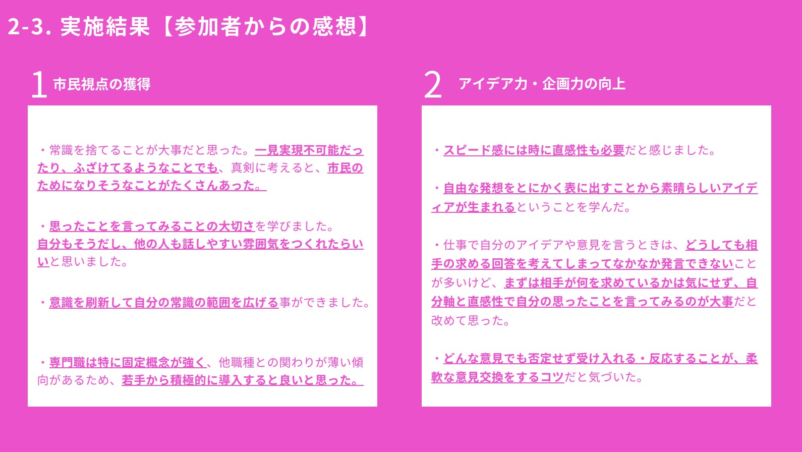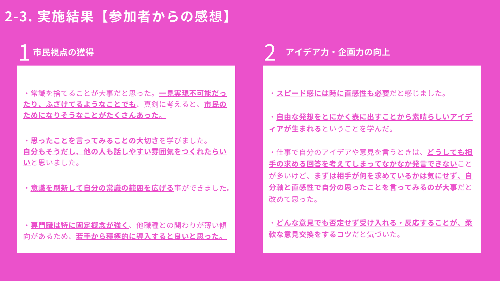 これまでにない新しい視点からの広報アイデアが多く出てきたことはもちろん、この2日間が参加した多くの方々にとって、未来の札幌市に対してワクワクするような時間になりました。