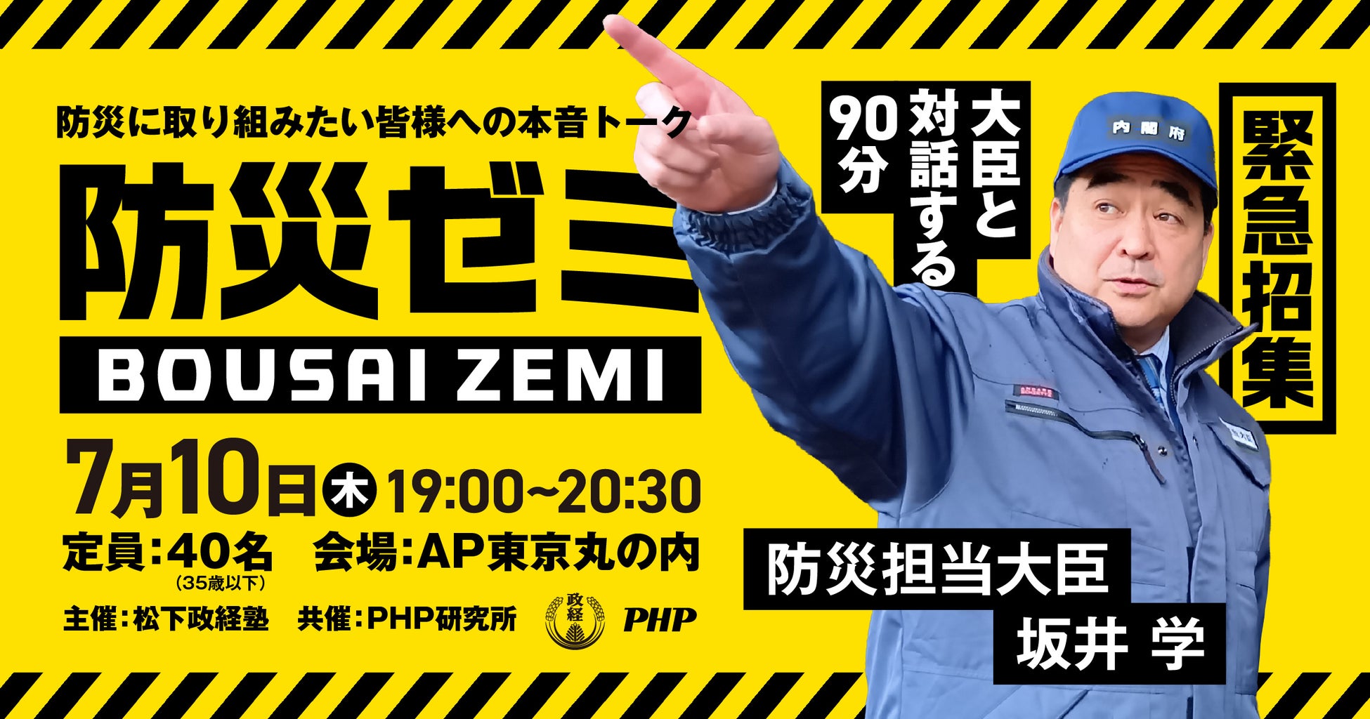公益財団法人松下幸之助志財団が運営する松下政経塾(塾長:遠山敬史、塾頭:尾関健治)と株式会社PHP研究所(代表取締役:瀬津要)は、2025年7月10日(木)に、AP東京丸の内(東京都千代田区)にて、防災担当大臣の坂井学氏を登壇者とする「防災ゼミ」を開催します。