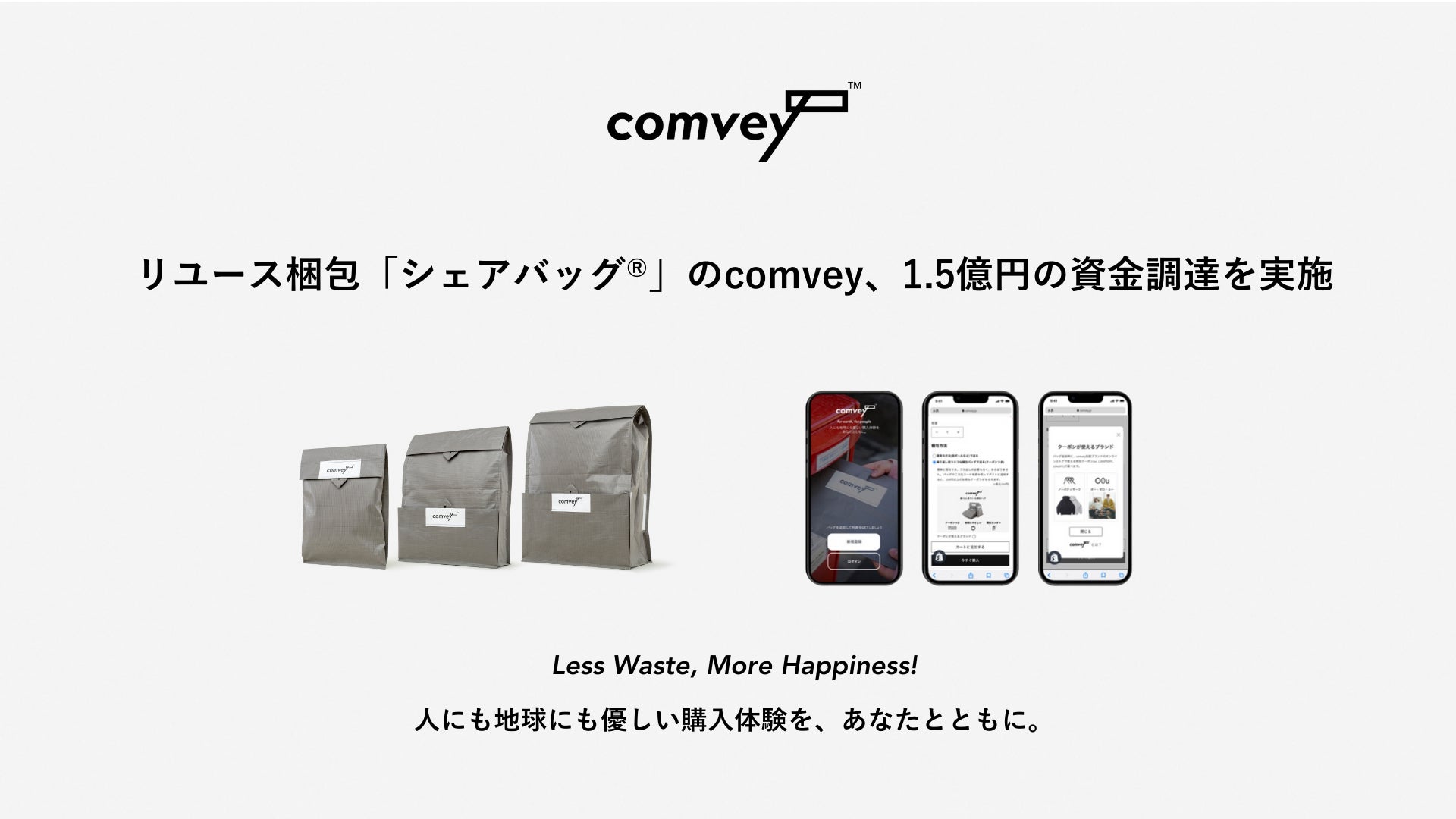 郵便ポストに返却できるリユース梱包「シェアバッグ®︎」およびオペレーションシステムを開発・提供する株式会社comvey(コンベイ、本社:東京都中央区、代表取締役:梶田伸吾)は、Kepple Capital、ココナラスキルパートナーズ、サザビーリーグなどを引受先とした第三者割当増資による約1億円の資金調達を実施したことをお知らせ致します。尚、これまでの投資ラウンド累計総額は約1.5億円(前回ラウンドにおけるNew Commerce Ventures、East Venturesを引受先とした第三者割当増資を含む)となります。「美しい物流」の実現の向けて、より一層事業成長を加速させて参ります。