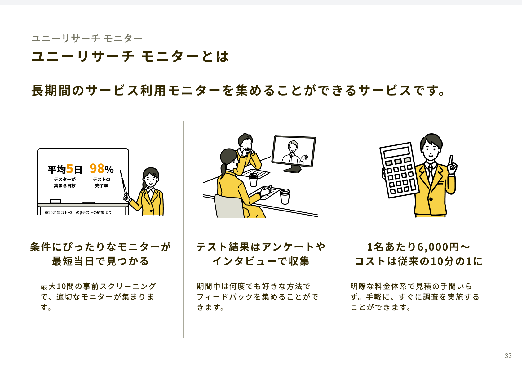 ユニーリサーチは「最短当日・従来調査コストの10分の1以下」でユーザーインタビューによるユーザー調査を可能にする国内最大級のインタビュープラットフォームです。企業は1名1時間のインタビューを8,000円~の低価格で、最短当日というスピードで実施できます。2024年5月時点で利用企業数1,920社、累計インタビュー数36,000件を突破。