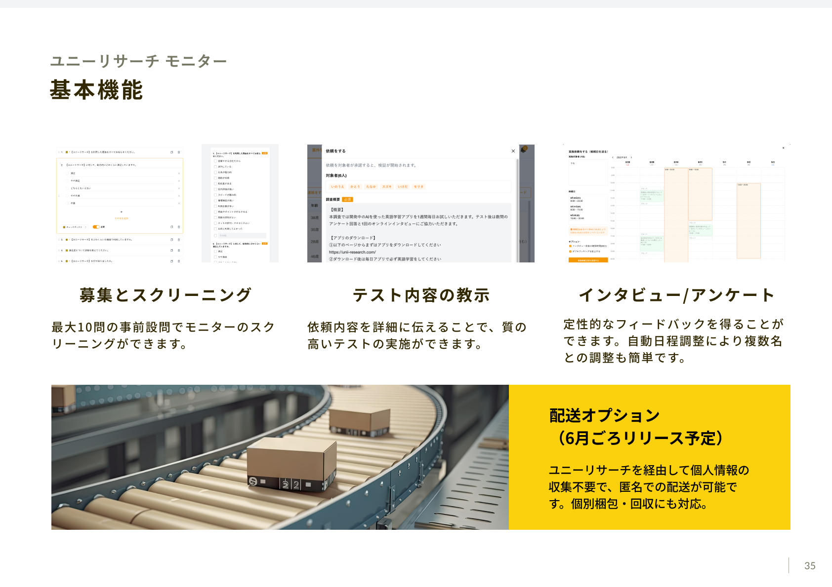 『ユニーリサーチ モニター』は、企業が新規事業のPoCや商品開発におけるホームユーステストのテストモニターをスピーディーかつ、低コストで募集可能な新サービスです。