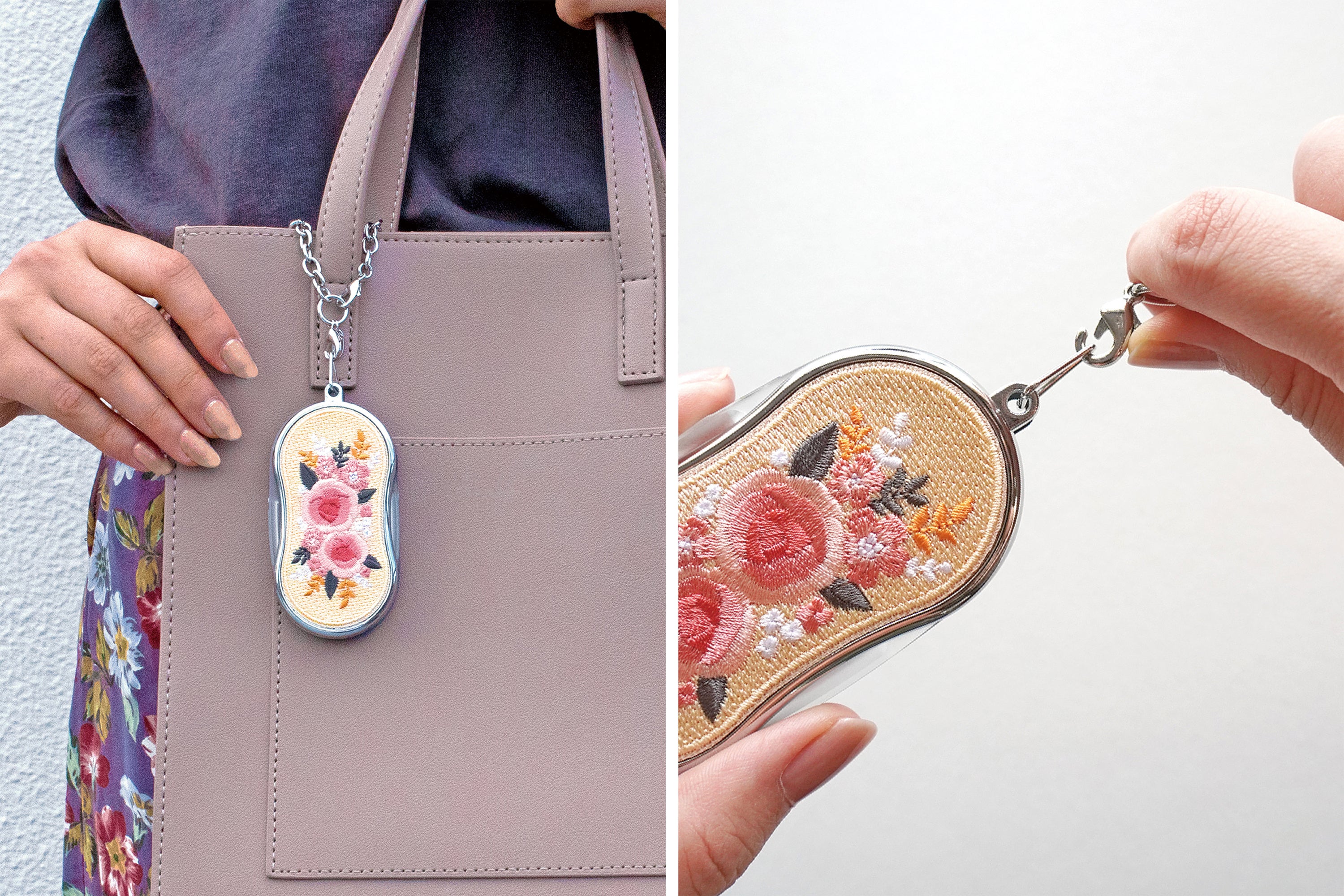 バッグにつけて持ち歩けて、おでかけ先でもサッとチェーンから外して使うことができます。