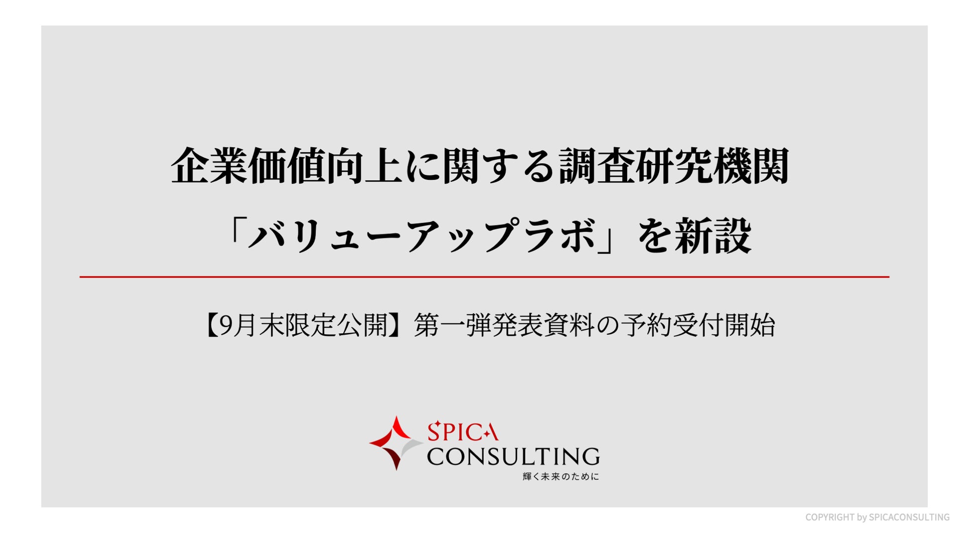 企業価値を最大化する「バリューアップコンサルティング」と「業界特化型M&A」を提供する株式会社スピカコンサルティング(本社:東京都港区、代表取締役:中原 駿男、以下「当社」)は、製造・物流・ヘルスケア・エネルギー・食品の5業界を対象に、業界ごとで異なる企業価値の向上に資する経営要素の分析や、最新の経営課題に関する情報発信を目的とする調査研究機関「バリューアップラボ」を設立します。9月末には「バリューアップラボ」初の発表物として、5業種に特化したホワイトペーパーを発表予定です。資料をご希望の方は、下記のお申し込み方法からご予約いただけます。