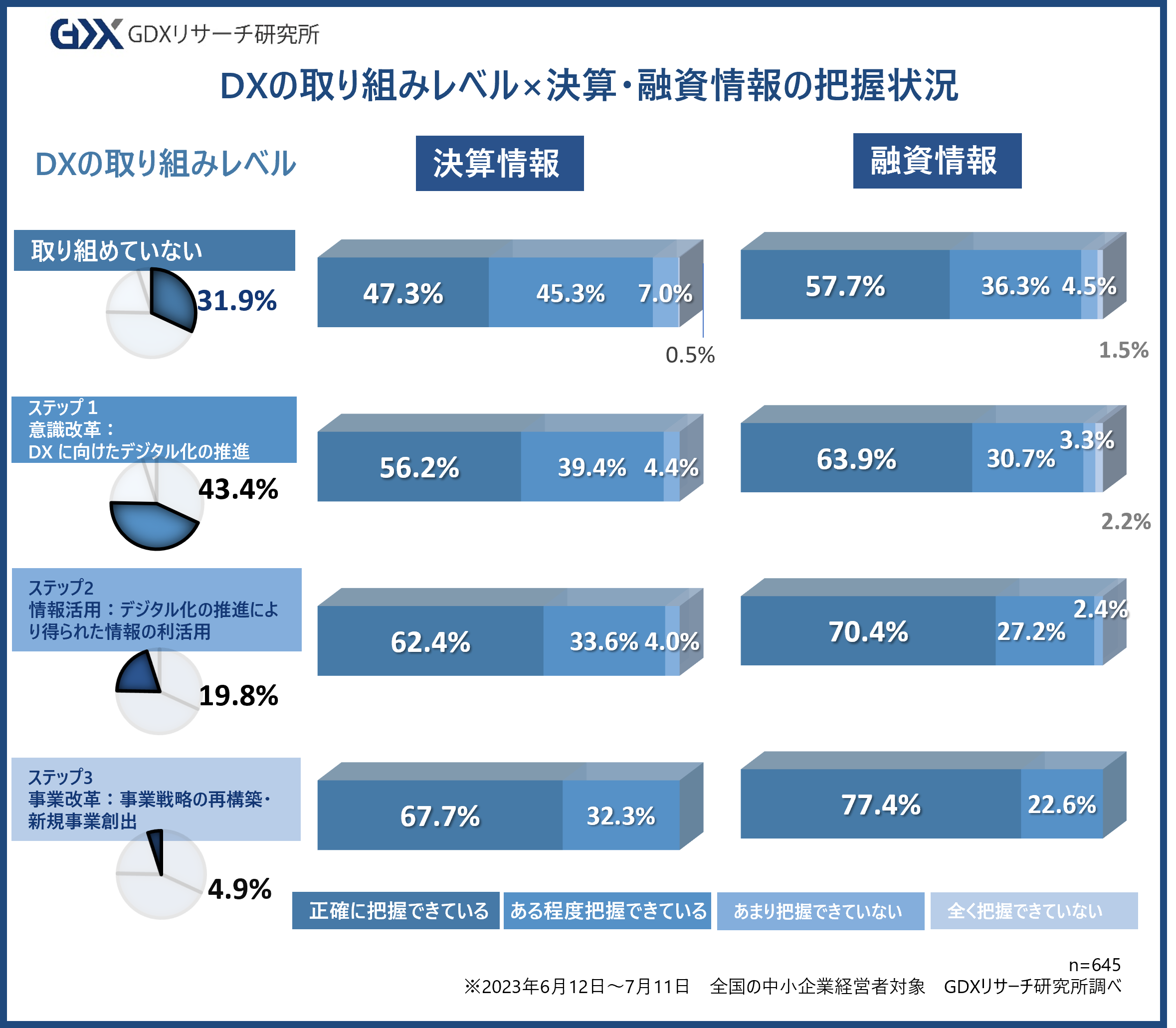 中小企業経営者に自社の決算情報、融資情報をどの程度把握できているか聞いたところ、DXの進捗度がステップ3(事業改革:事業戦略の再構築・新規事業の創出)に至っていると回答した経営者は、67.7%が決算情報、77.4%が融資とその返済状況を「正確に把握できている」と回答しました。