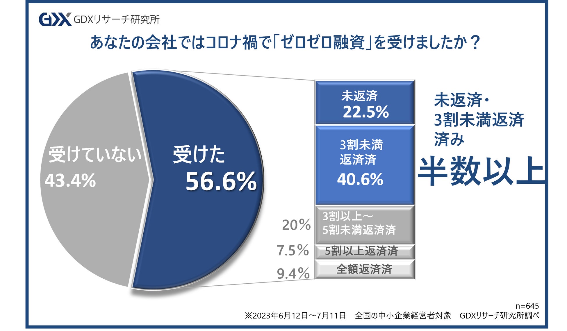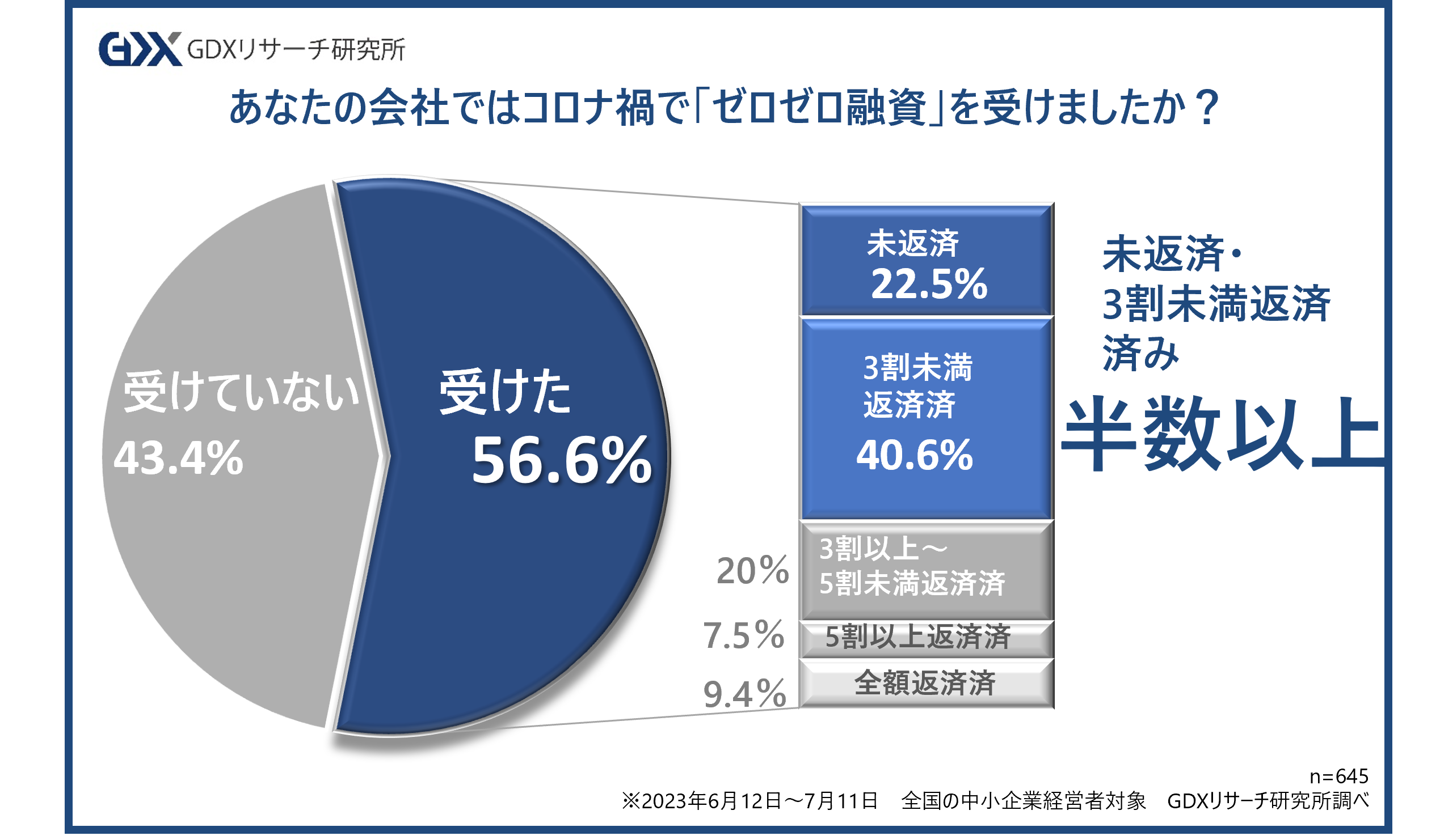 中小企業経営者に、ゼロゼロ融資を受けたか聞いたところ、56.6%と約6割が「受けた」と回答しました。