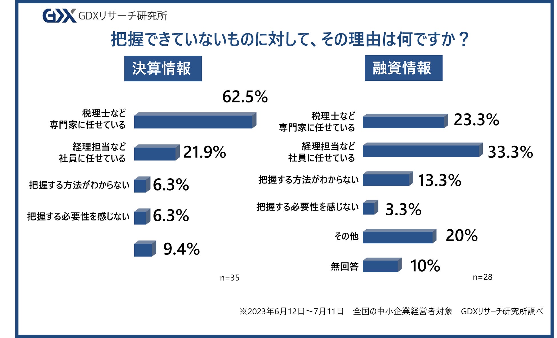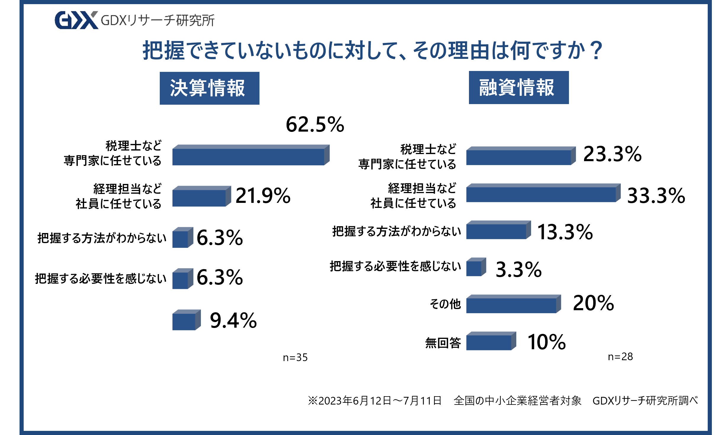 中小企業経営者に自社の経営状況について正確に把握できていない理由を調査した結果、決算情報について62.5%が「税理士など専門家に任せている」と答え、融資とその返済状況について33.3%が「経理担当者など社員に任せている」と回答しました。