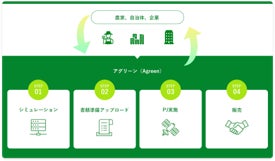 農家、自治体、企業等のカーボンクレジット創出量を試算するとともに、必要書類をAgreenのサービスサイトへアップロードすることで、複雑な申請手続きからプロジェクトの実施、クレジットの販売まで一気通貫で支援する画期的なサービスです。