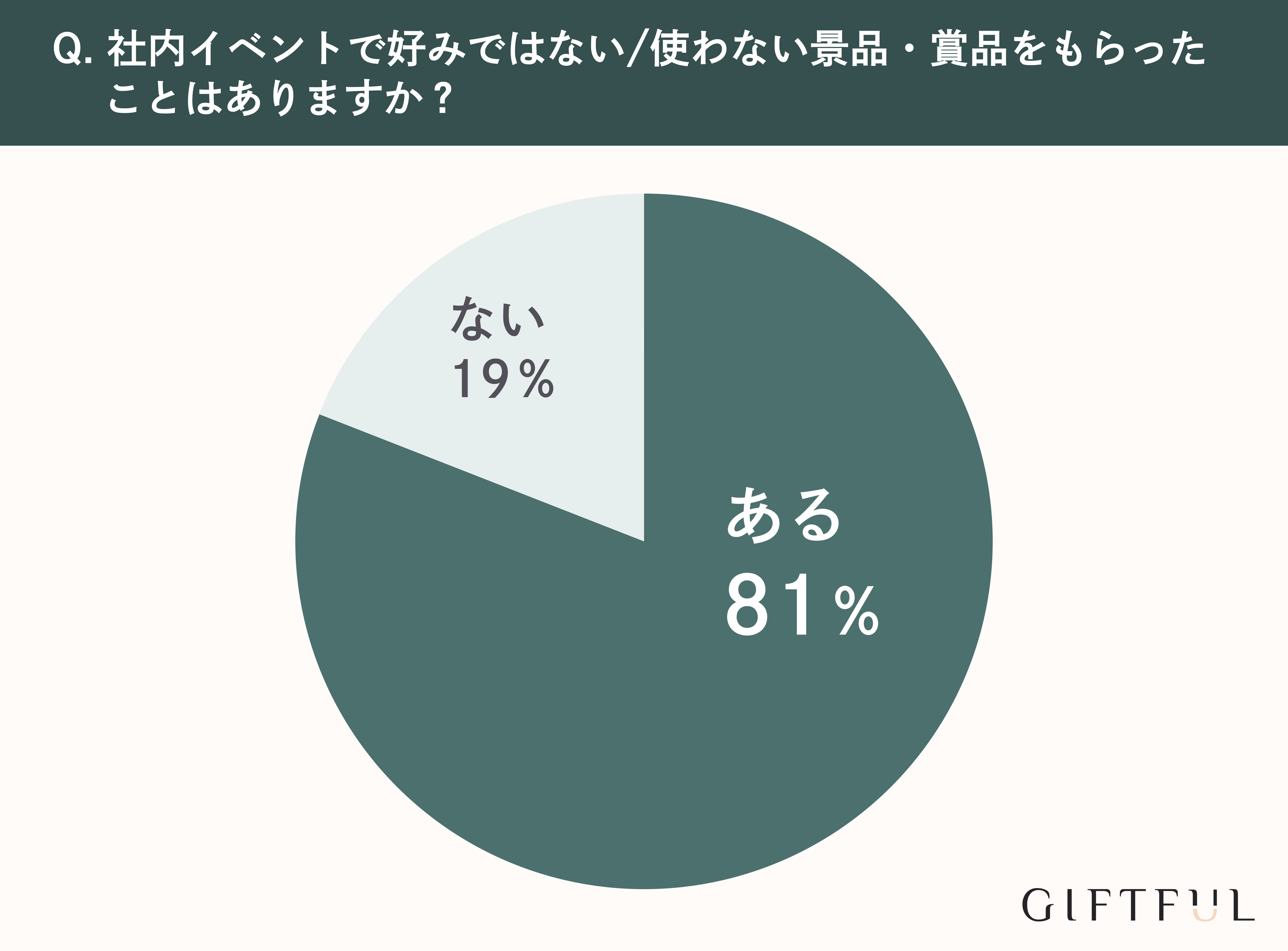 年末の社内イベントでは多くの企業で、表彰式が行われたり、ゲーム大会やビンゴ大会などのお楽しみコンテンツが用意されたりしています。そういった社内イベントで賞品や景品をもらったことがある方に、もらったものが好みではなかった/使わなかったことがあるかを聞いたところ、81%の方が「ある」と回答する結果になりました。