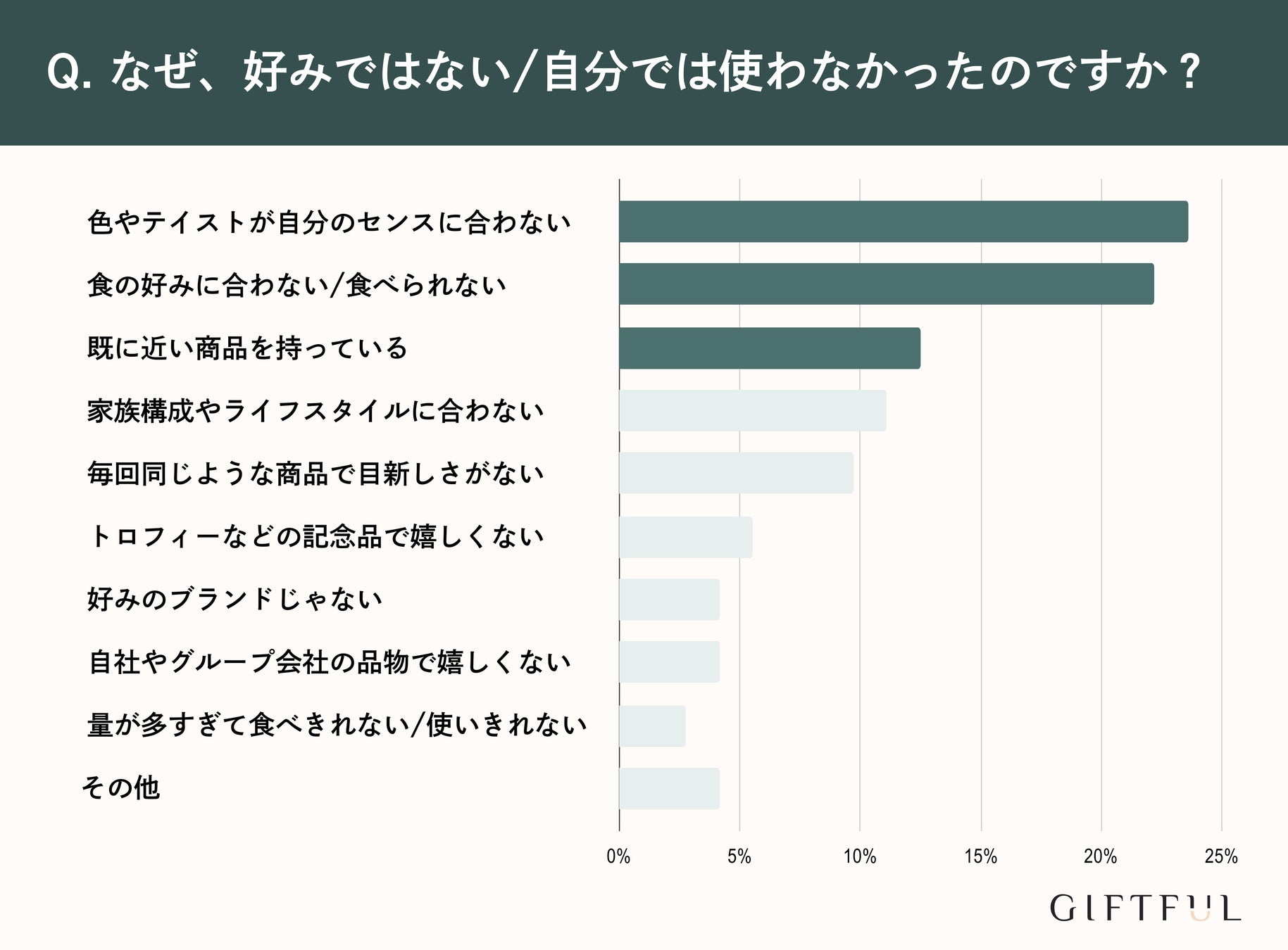 さらに「好みではない・使わなかった」理由は、1位「自分のセンスに合わないものだったから」、2位「食の好みに合わない/食べられないものだった」、次いで「既に持っているものだったから」が続きました。
