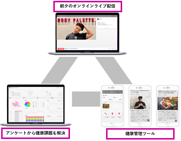 ボディパレットは上記3つのアプローチにより社員の健康改善を実現する総合的な企業フィットネスソリューションです。