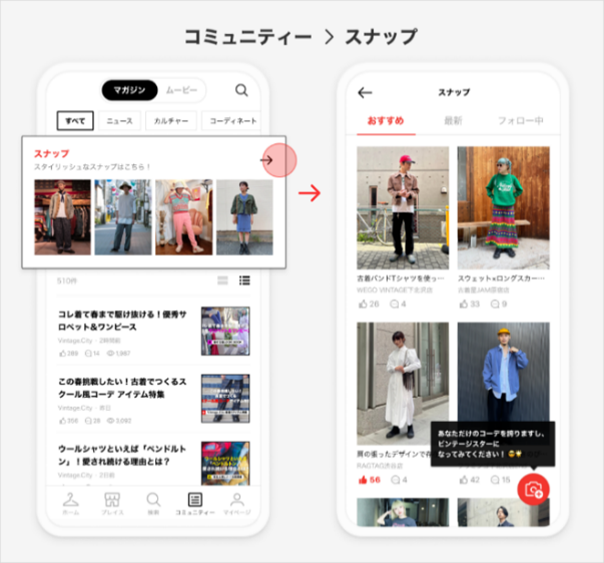 Vintage.Cityのユーザーが日常のヴィンテージファッションスタイルを共有し、お互いにインスピレーションを与えることのできるコミュニティサービスです。実際の古着ショップのスタッフのコーデから街で見かけたお洒落さんのスタイルまで、 Vintage.Cityのユーザーなら誰でもクリエイターになり、自分のコーデをスナップ掲示板に登録して共有することができます。