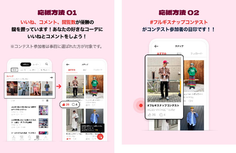 フルギスナップコンテストは、2023年5月26日(金)にVintage.Cityアプリに新たに実装されたスナップ機能内で2023年7月18日(火)~31日(月)の期間にアップされたコーデを対象にアプリ内で投票を行い、ランキング形式で競います。ランキング上位5名のみ、8月6日(日)に東京ビッグサイトで開催される「フルギフェス®with Vintage.City」にて来場者による最終投票を行います。