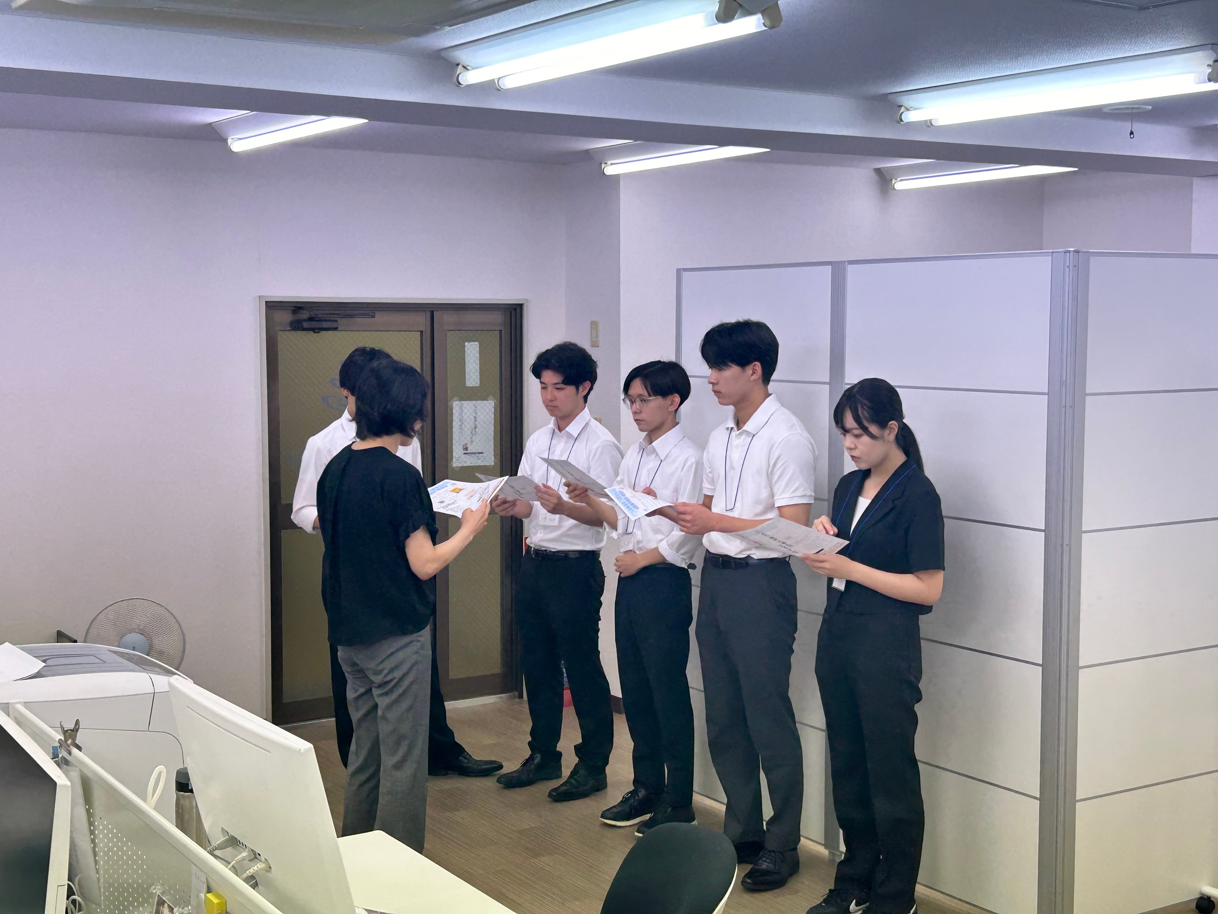 この5日間にわたる課題解決型インターンシップにおいて、インターンシップ生5名のグループで協力しながら情報を整理し、課題を明確化した上で、アイディアを出し合って実務経験をおこなってもらいました。その上で、お客様企業へのアポイント、さらには弊社の担当者とともに訪問、学生たちが記者となって経営者様へのインタビューもしてもらいました。