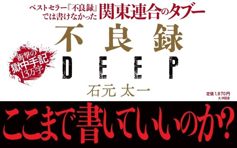 【株式会社大洋図書発行・発売の新刊書籍】【不良録DEEP24.9.24(火)発売】のご案内です これは、『不良録』で描けなかった関東連合のタブーだ… 著者 石元太一による衝撃の獄中手記13万字!!