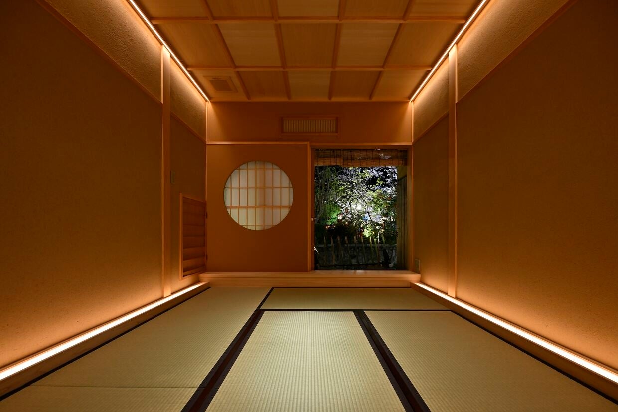 家全体を通じて、京都の季節の美しさを額縁に収めるジェスチャーが配置されています。源光庵の「悟りの窓」にインスパイアされた円形の窓、障子戸のある開放的な畳の間、そして川沿いの露天風呂。
