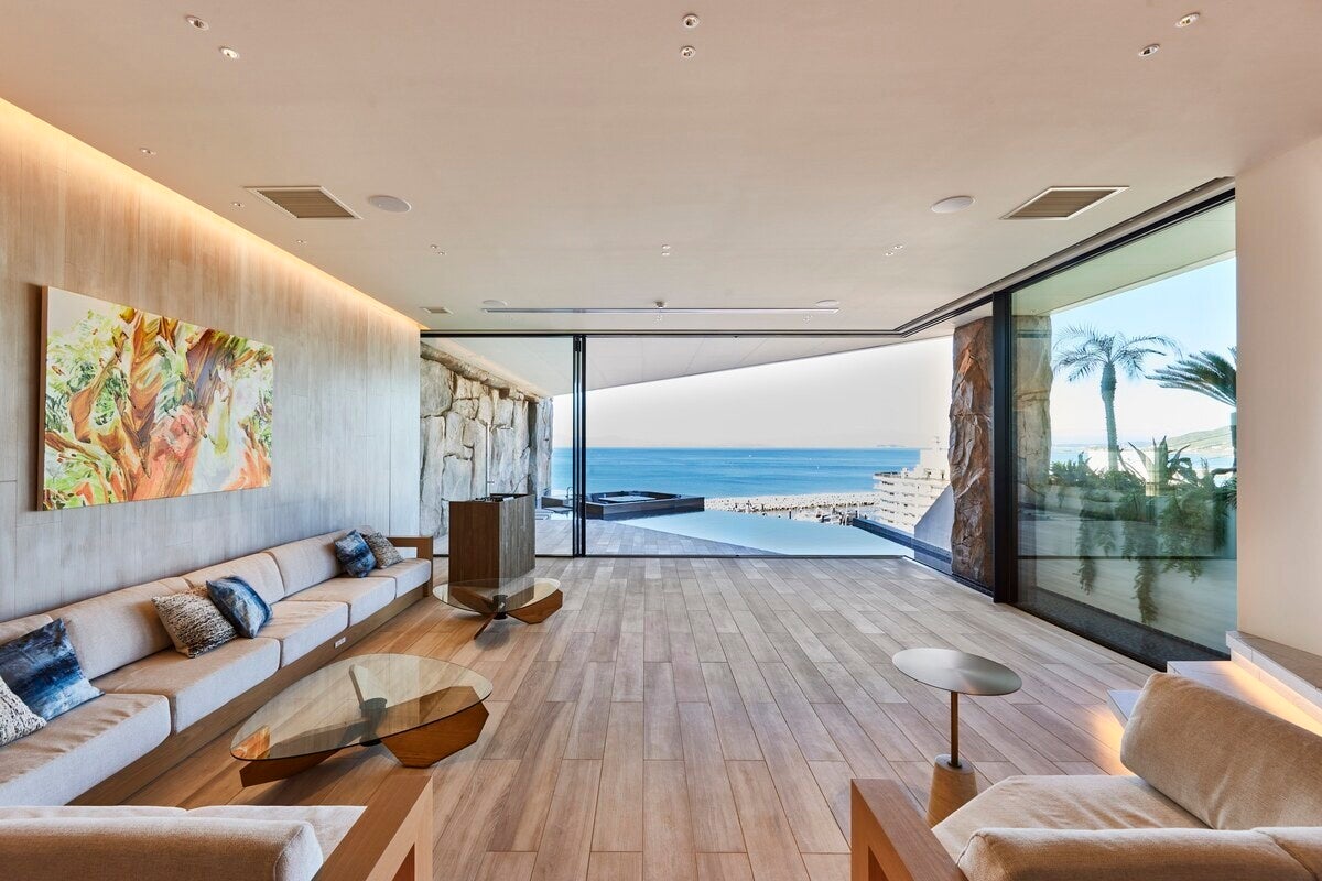 床から天井まで広がる大開口部は、室内空間を豪華なパノラマビューで縁取り、リビングエリアは広大な太平洋の眺望を活用し、室内の快適さと外部の壮大さとのシームレスな統合を実現しています。