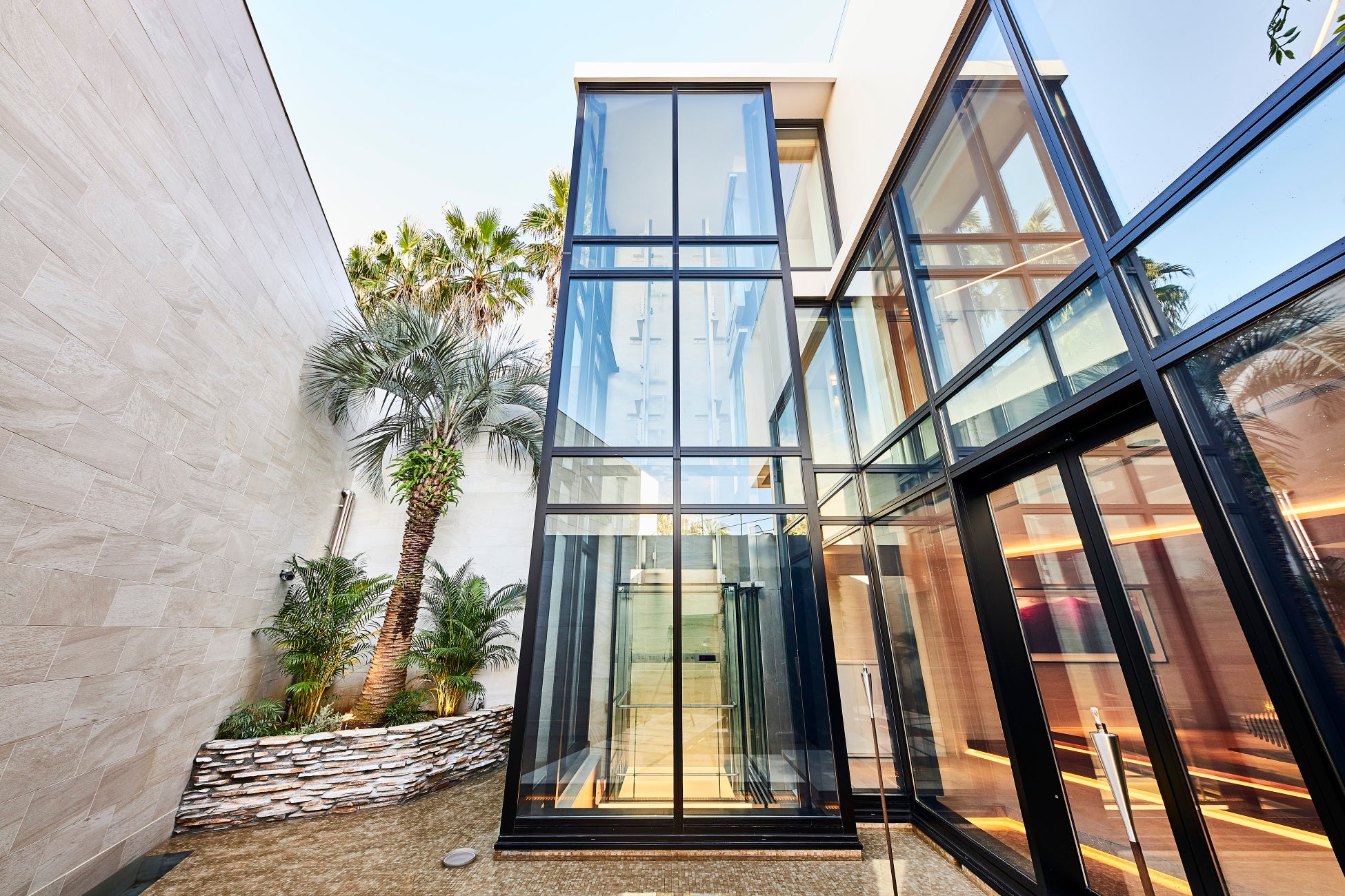 透明なガラスエレベーターの統合は、劇的な垂直動線体験を創出し、佐島の自然景観との視覚的な繋がりを維持しながら、単なる移動を芸術的な旅へと昇華させています。