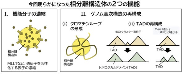 これらの2つの機能により相分離構造体がHOX遺伝子群など白血病に関わる遺伝子の選択的な活性化を促して病態に寄与していることが示唆されます。今後の新規治療薬の開発などに貢献できる研究成果と期待されます。