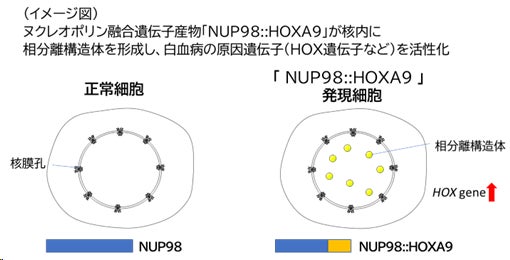 2つの異なる遺伝子が染色体の転座により融合して形成される融合遺伝子は、がんなど様々な病態で見出され病気の原因となることが知られています。核膜孔の構成因子であるタンパク質(ヌクレオポリン)「NUP98」や「NUP214」の遺伝子は、白血病の患者においては転写因子など様々なパートナーとなるタンパク質の遺伝子と融合遺伝子(以下「ヌクレオポリン融合遺伝子」という。)を形成することが知られています。 これまでヌクレオポリン融合遺伝子の発現により、白血病細胞の増殖や維持に重要なホメオティック(HOX)遺伝子群など特定の遺伝子が活性化されることが分かっていました。またヌクレオポリン融合遺伝子から作られるタンパク質(融合遺伝子産物)の特徴として、"液液相分離"と呼ばれるプロセスにより細胞核内で特徴的な構造体(以下「相分離構造体」という。)を形成することが知られていました。しかしながら、相分離構造体の形成がどのように遺伝子発現活性化に関与しているのか、そのメカニズムは不明でした。