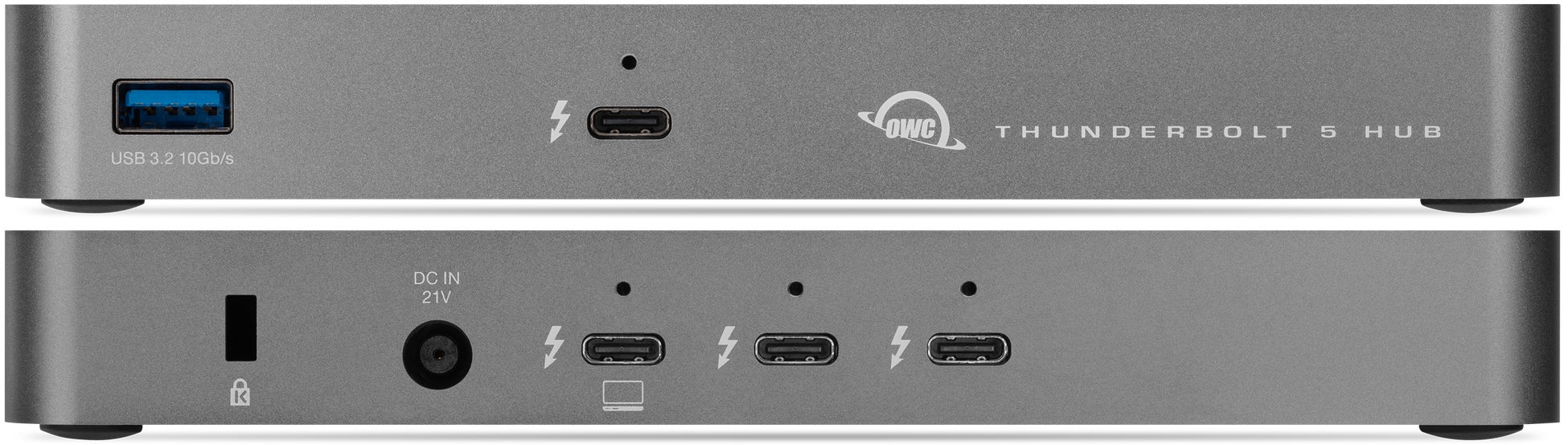 OWC Thunderbolt 5ハブは、1つのThunderbolt 5ポートを3つのThunderbolt 5ポートと1つのUSB-Aポートに拡張することで、Thunderbolt 5ポートを十分に搭載していないホストの接続性を大幅に拡大します。
