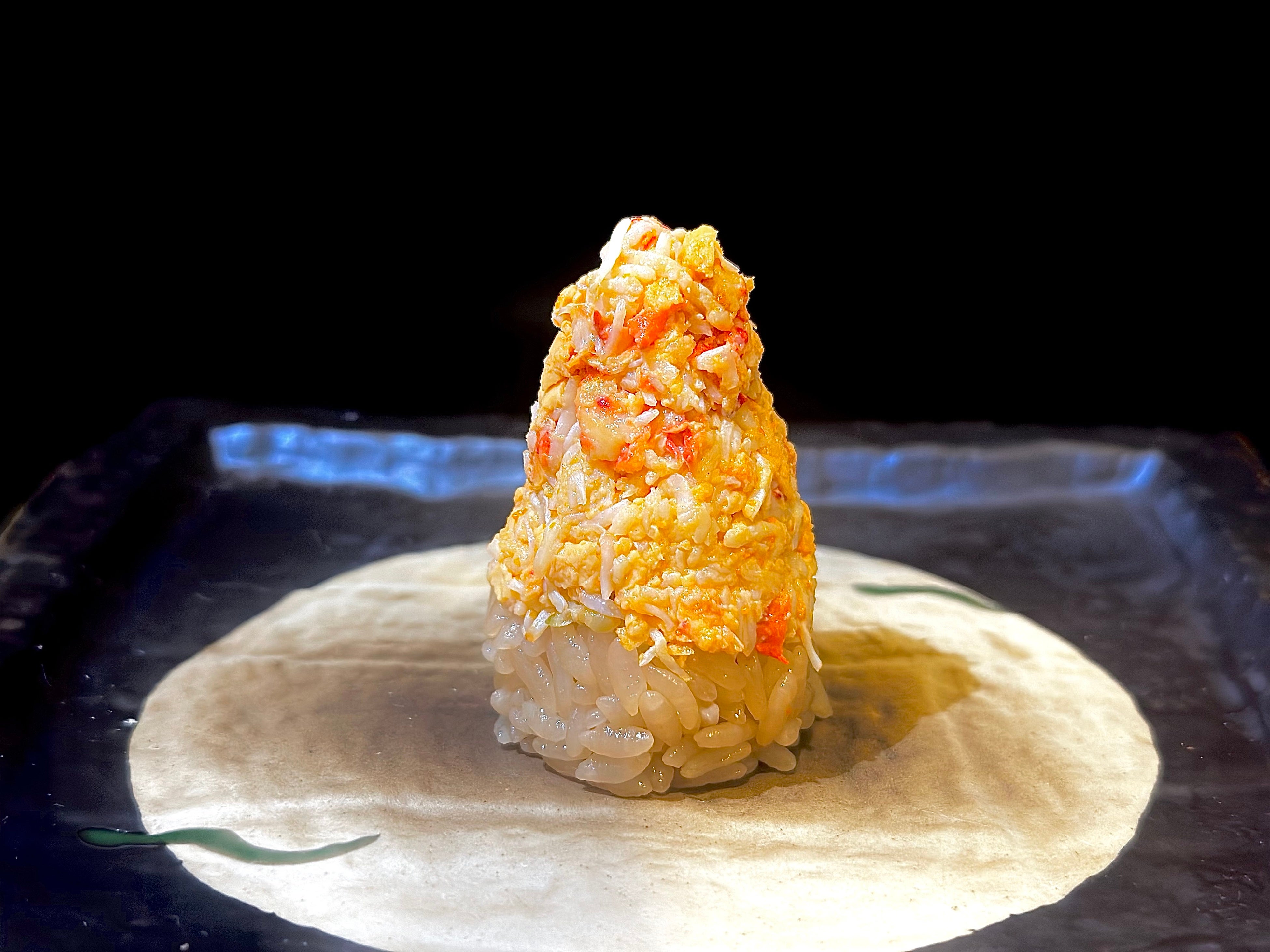 北海道産、旬の毛蟹の身と味噌をふんだんに使用した贅沢な逸品。この商品は、当社の回転寿司業態である「廻転鮨 銀座おのでら本店」「廻転鮨 銀座おのでら 京都店」の2店舗にて提供いたします。