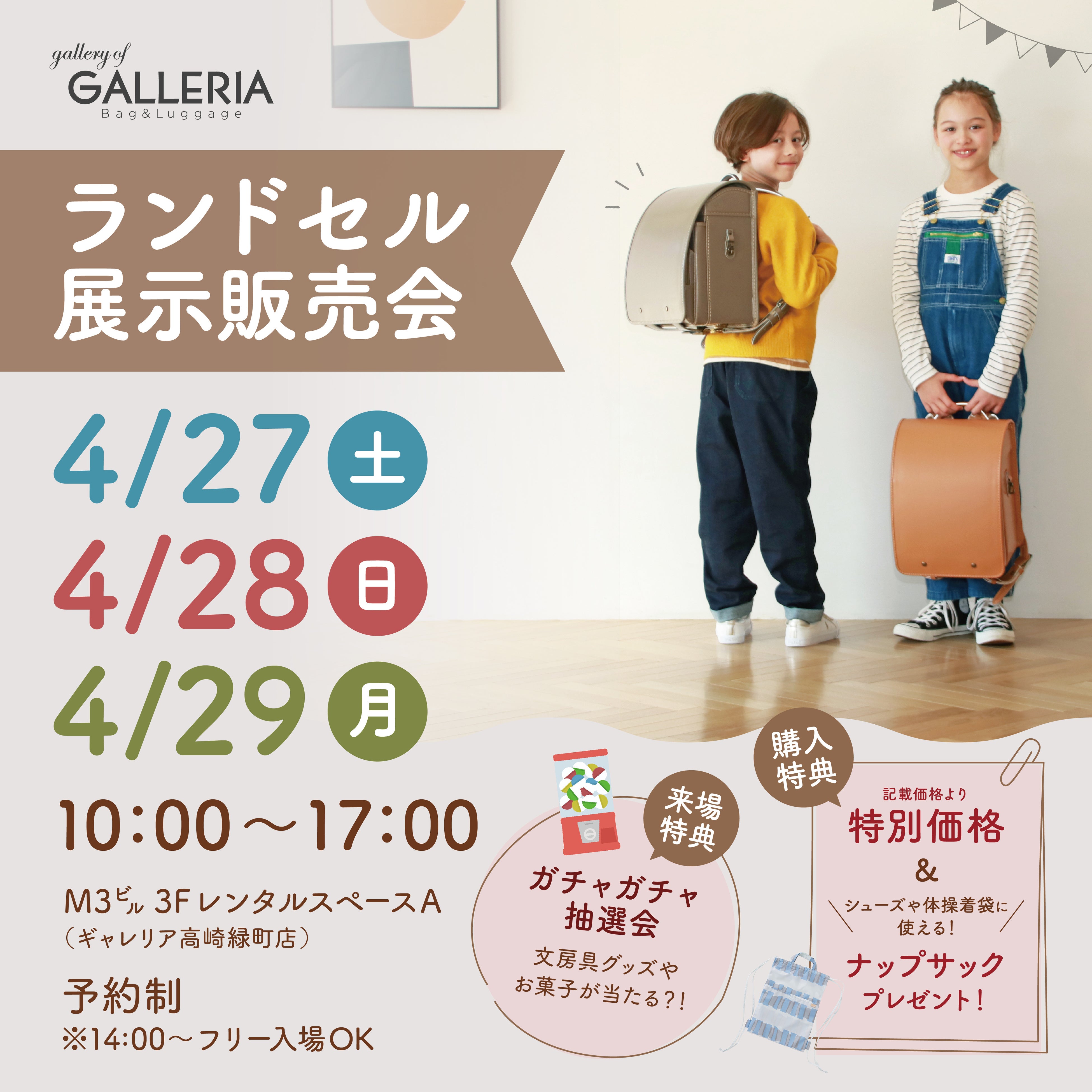 鞄・ライフスタイルグッズのセレクトショップ「ギャレリア高崎緑町店」(運営:株式会社ギャレリア・ニズム)は、同社が運営する複合商業施設「M3㌱」のレンタルスペースにて、2024年5月25日(土)・5月26日(日)にオオバランドセル展示販売会(2025年度ご入学向け)を開催いたします。